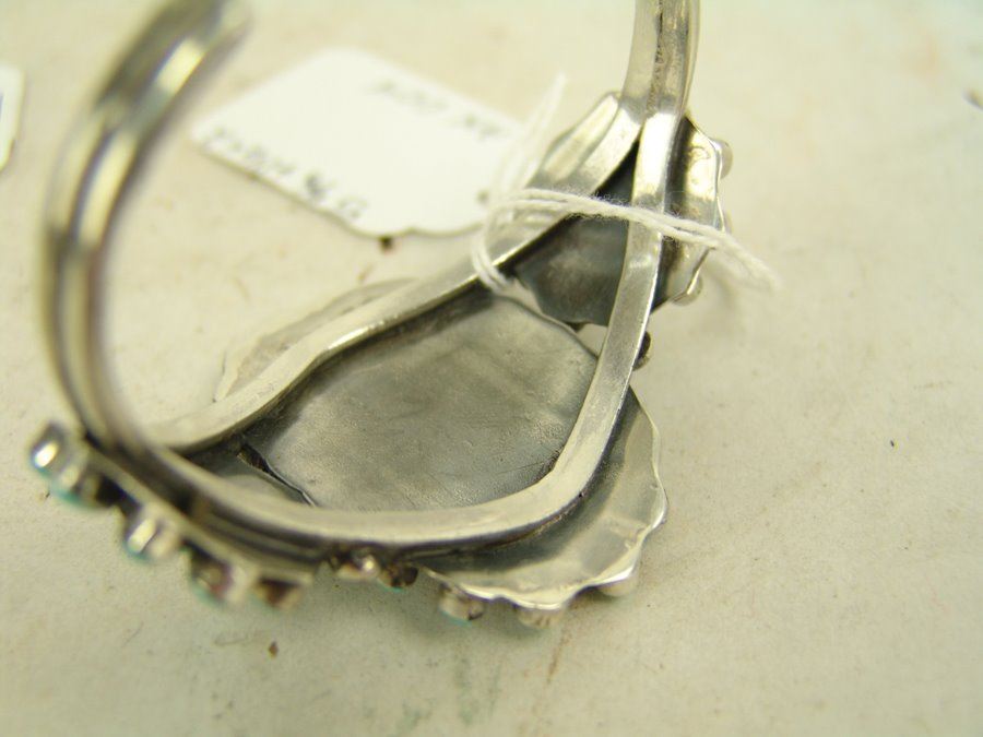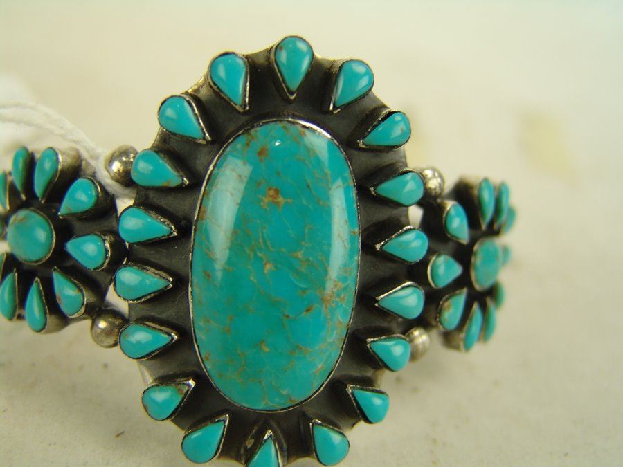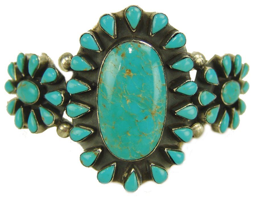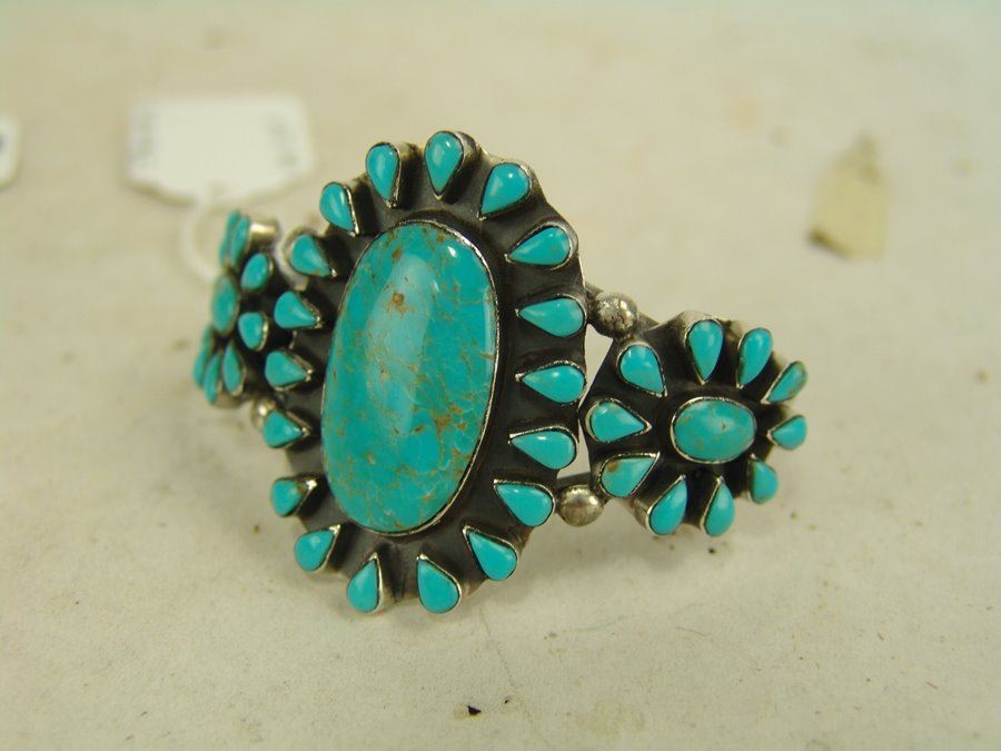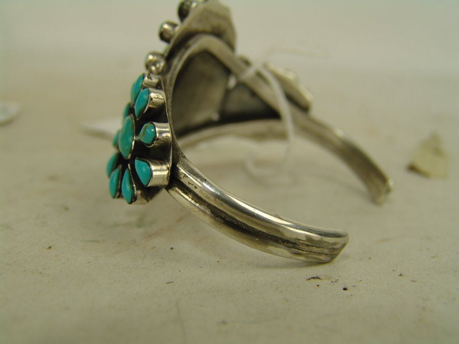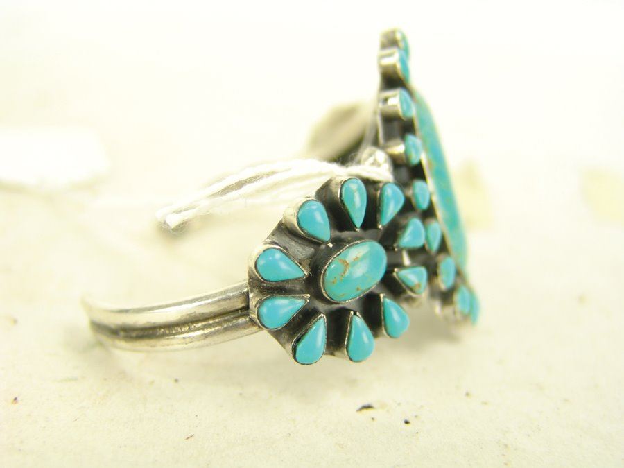Classic sturdy gauge two-band all silver bracelet with one large and 40 small Cerillos turquoise stones. Excellent condition, unsigned.,,5-5/8" + 1-1/2" x 2-3/4"