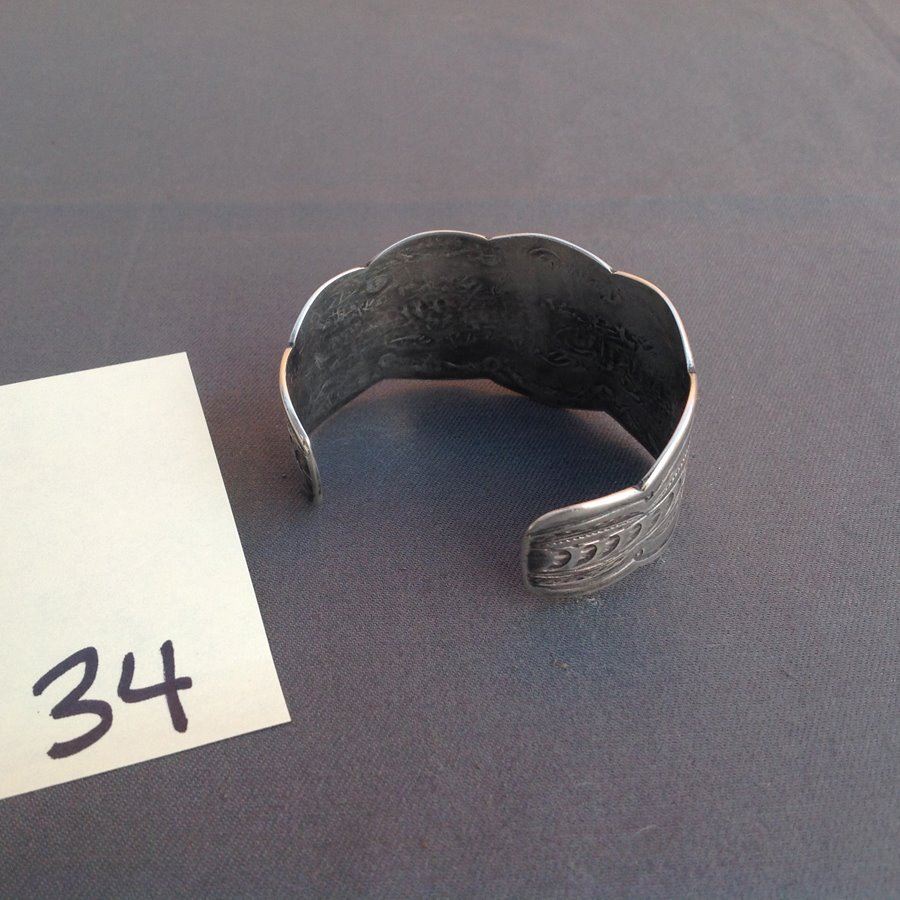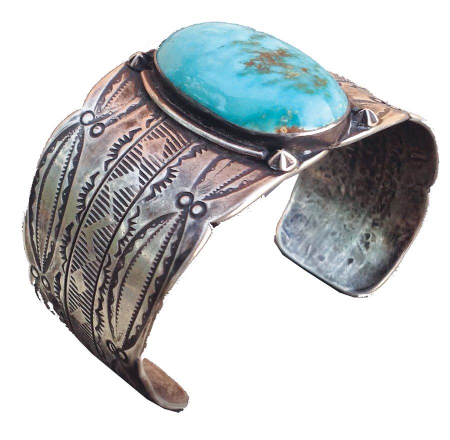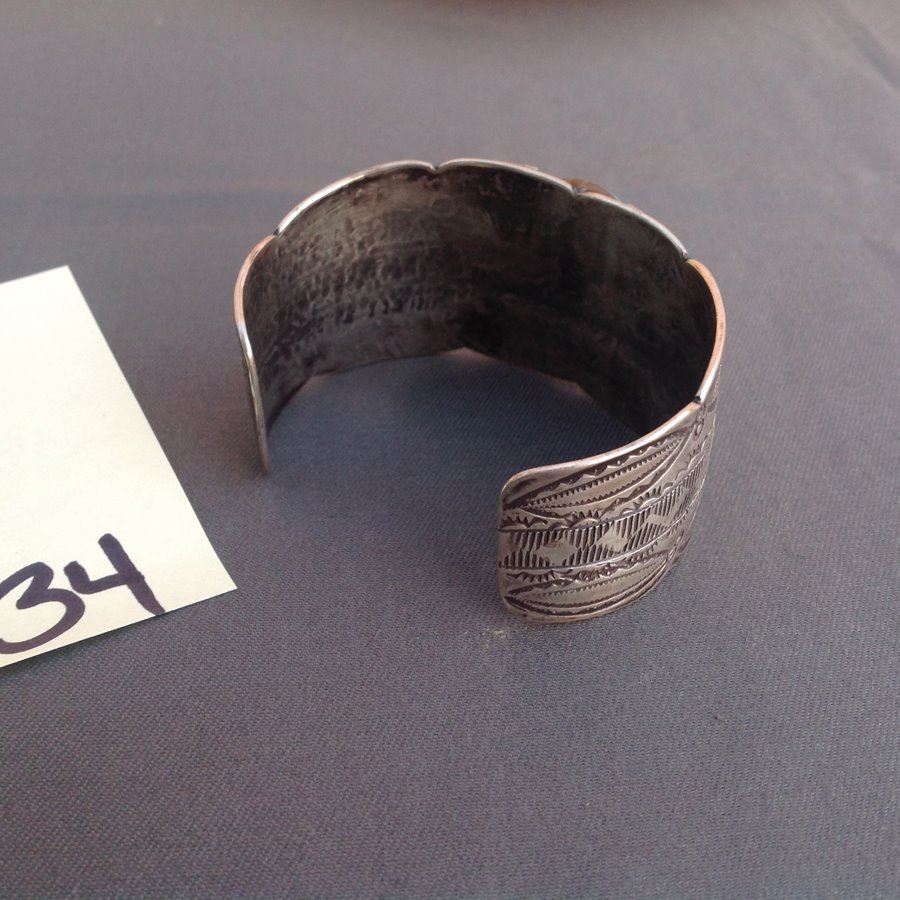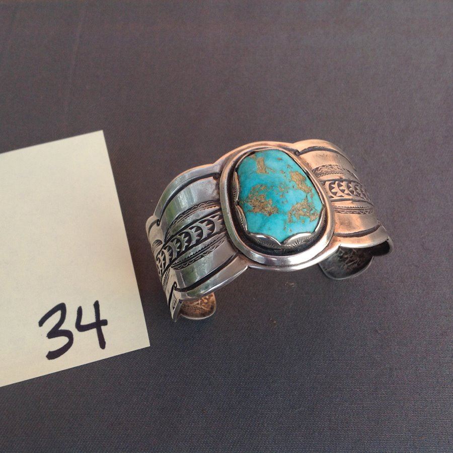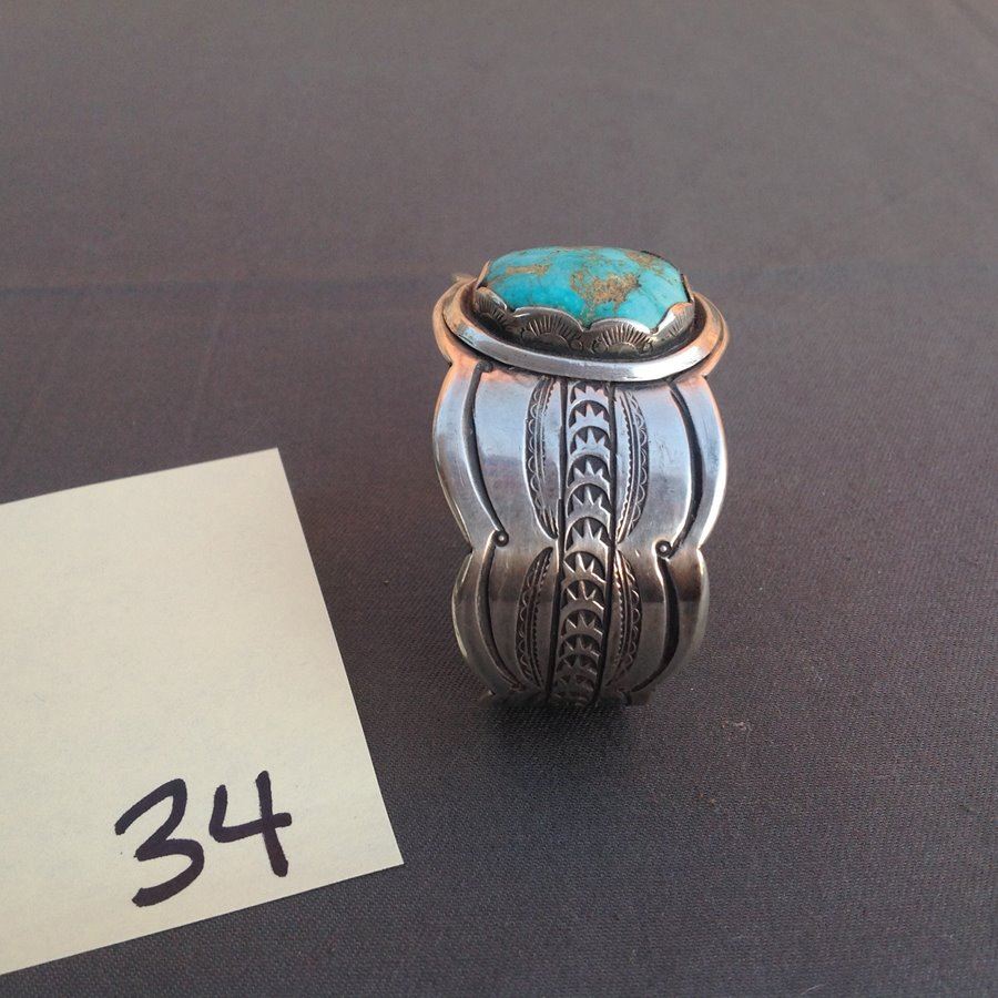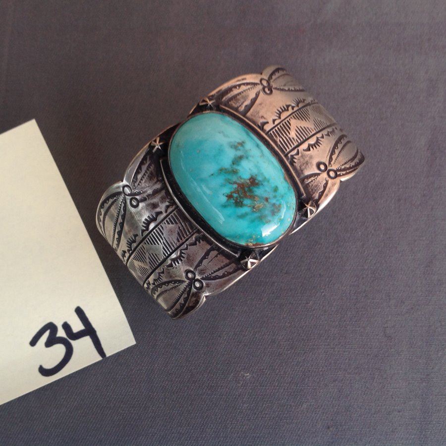 Vintage hand wrought wide all silver cuff bracelet with elaborate stamp work and large single turqoise stone. Good Condition.,,1 1/2" x 5 1/2" x 101/2"