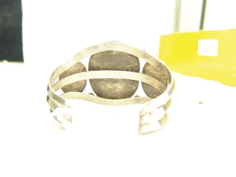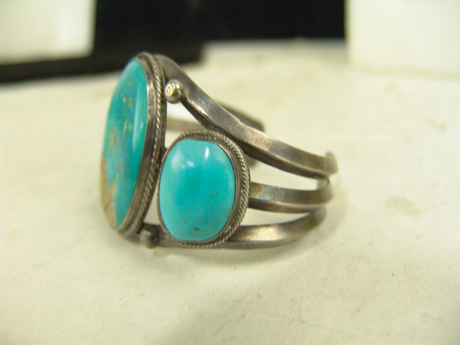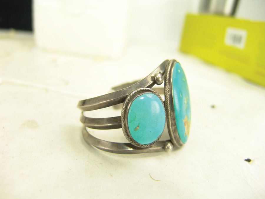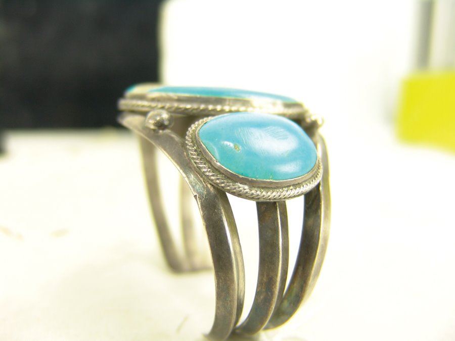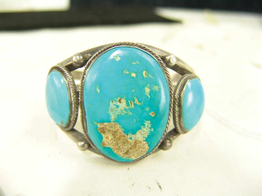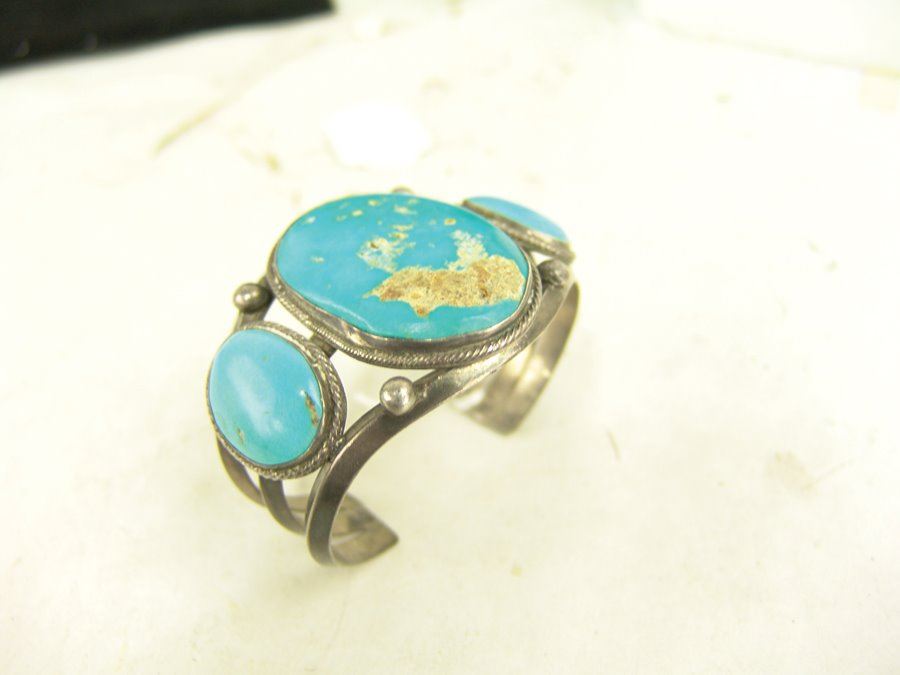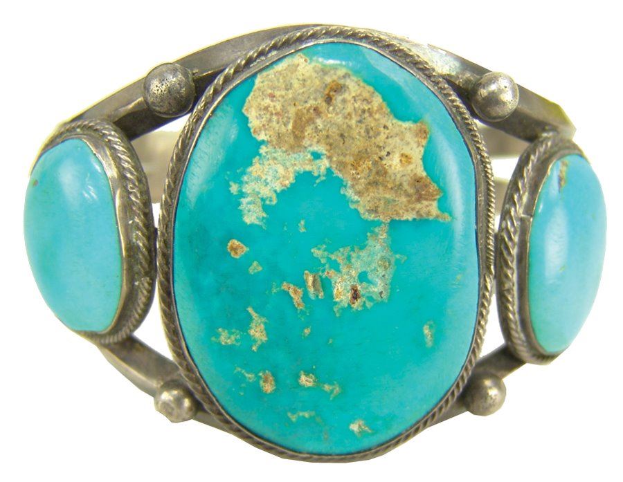 Classic three band, three-stone, all silver bracelet with bright blue Fox (?) turquoise stones. Very good condition, light scuffs on stones.,,5-3/8" + 1-1/8" x 1-3/4"