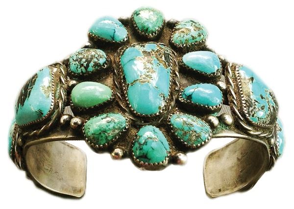 Late 1900s 6-1/2" x 2-1/4" Classic, heavier gauge turquoise and silver cluster style bracelet with (23) matching blue stones. Very good condition.