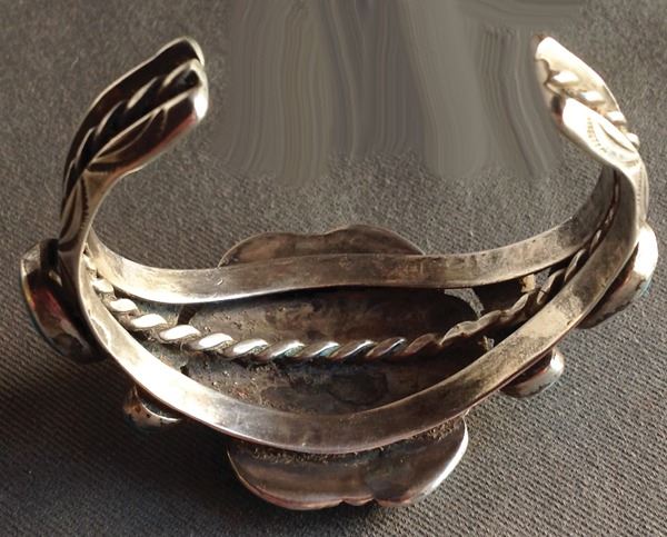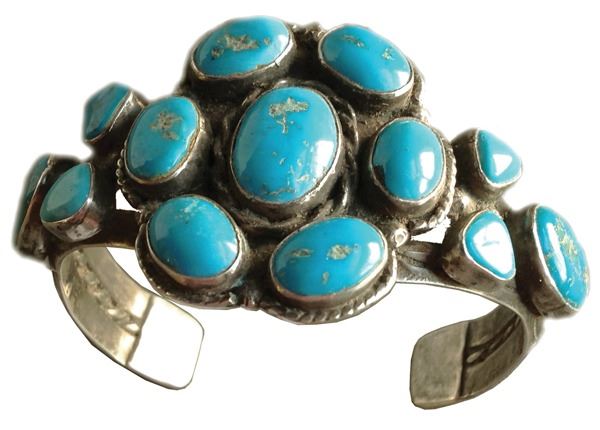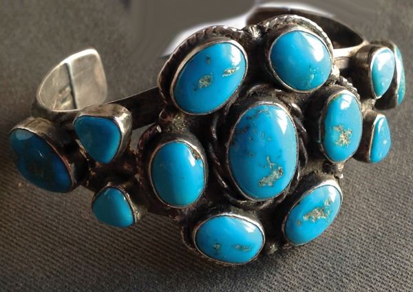 Ca. 1970s 5" + 1-1/4" x 1-1/2" wide. Traditional, three-band silver and turquoise bracelet done in cluster style with 13, matching Blue Gem stones. Very good condition.