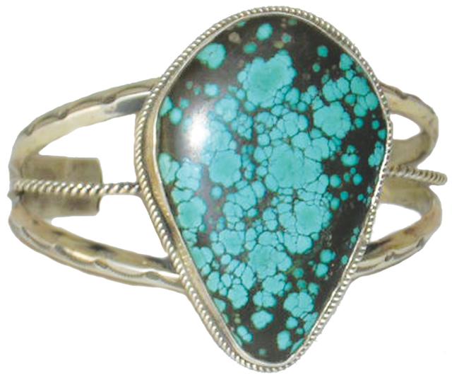 Circa 1970s, Triple band silver cuff bracelet with large natural spiderweb turquoise. 6-1/2" plus 1-1/4" gap x 2" wide