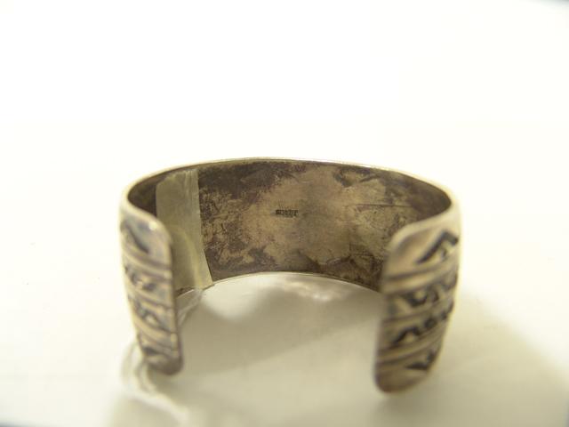 Late 1900s, J. Lucio, Hand stamped all silver cuff bracelet adorned with three bright blue turquoise stones. 5-1/2" plus 1-1/4" gap x 1-1/4" wide