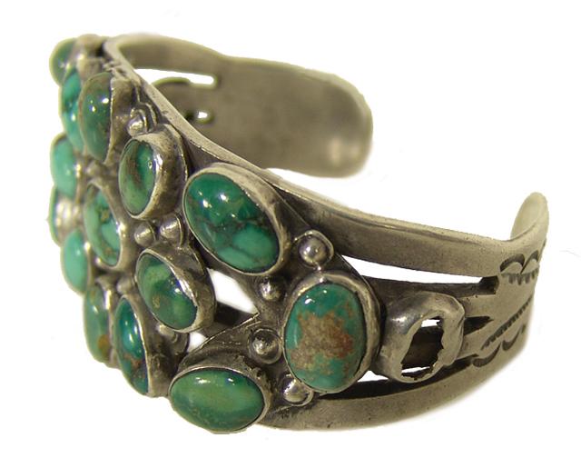 Mid 1900s, Heavy, hand stamped, all-silver cuff bracelet adorned with 15 beautiful Royston turquoise stones. 5-1/2" plus 1-1/4" gap x 1-3/8" wide