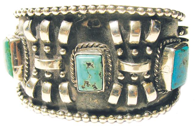 Circa 1964, Majestic heavy silver cuff-style bracelet with three square cut natural turquoise cabochons - hallmark "R R". 5-3/8" plus 1-5/8" gap by 1-7/8" wide