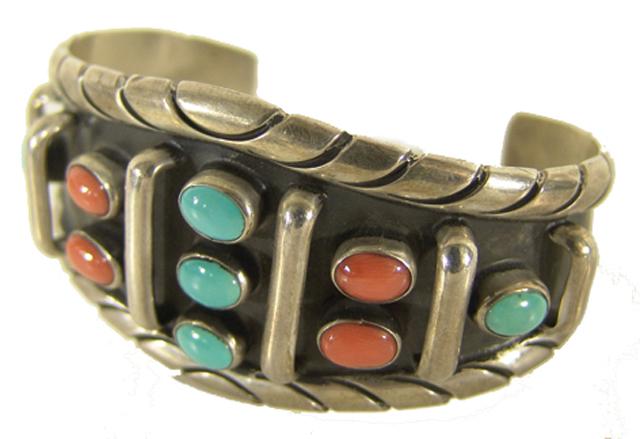 Circa 1980s, Beautiful nine-stone turquoise, coral, and silver cuff bracelet. 5-5/8" plus 1-1/2" gap x 1-1/2" wide