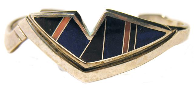 Contemporary, Beautiful cuff bracelet with channel work lapis and spiny oyster and jet inlay. 6-3/8" plus 1" gap x 1" wide