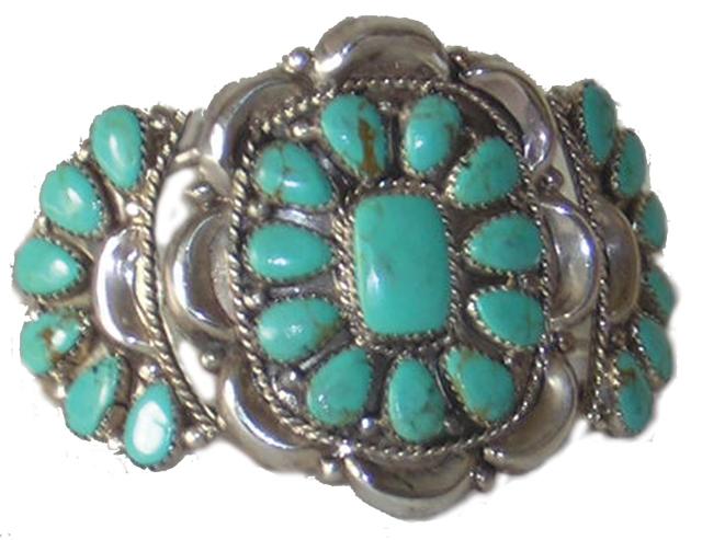 Circa 1980s, Beautiful sterling and turquoise cluster bracelet, stamped EA. 6-1/2" plus 1-1/4" gap x 2" wide