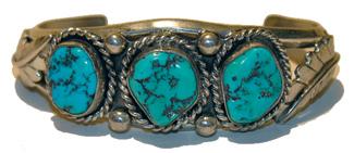 Beautiful bracelet with three natural spiderweb turquoise cabochons and rope bezels - hallmark M L. 5-3/4" plus 1-1/2" gap x 1" wide