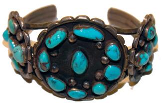 Unusual Old Pawn bracelet with multiple all natural turquoise cabochons. 5-1/4" plus 1" gap x 1-3/4" wide
