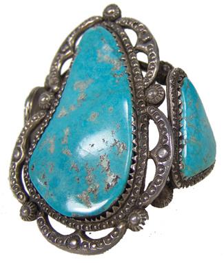 Beautiful hand worked silver bracelet set with 3 large turquoise stones. 5-1/2" plus 1" gap x 3-1/2" wide