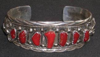 Seven-stone red coral and sterling bracelet with leaf overlay design. 6-7/8" plus 1" gap x 1" wide