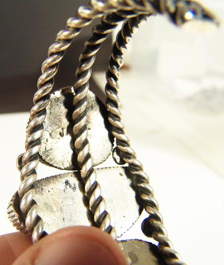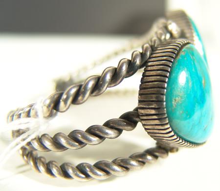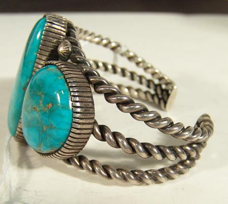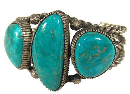 Excellent three-twist band bracelet with three large natural Nevada turquoise cabochons. 5-1/2" x 1" x 1-5/8"