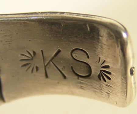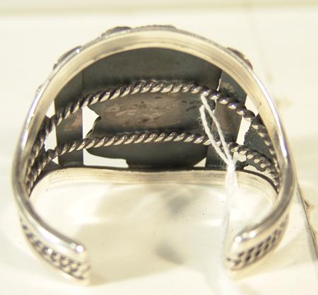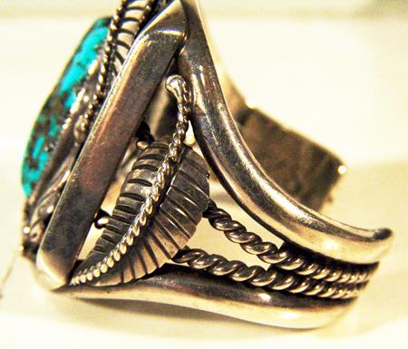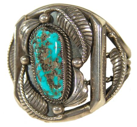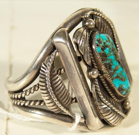 Classic heavy silver bracelet with leaf motif and central natural turquoise cabochon. Hallmarked "KS". 4-3/4" x 1-1/8" x 2-1/8"