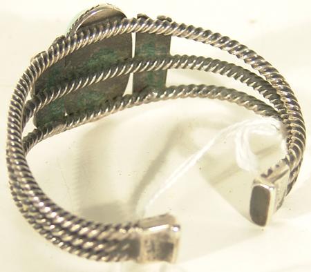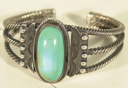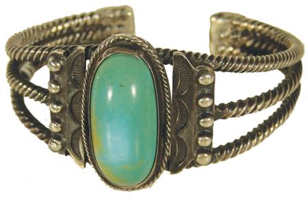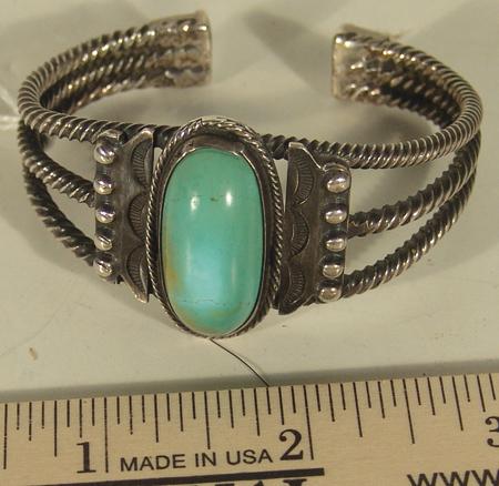 Traditional heavy gauge twist silver bracelet set with a single turquoise stone. Condition: very good with minor hairline stress crack. 5-7/8" plus 7/8" gap x 1-1/2" wide.