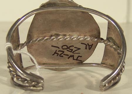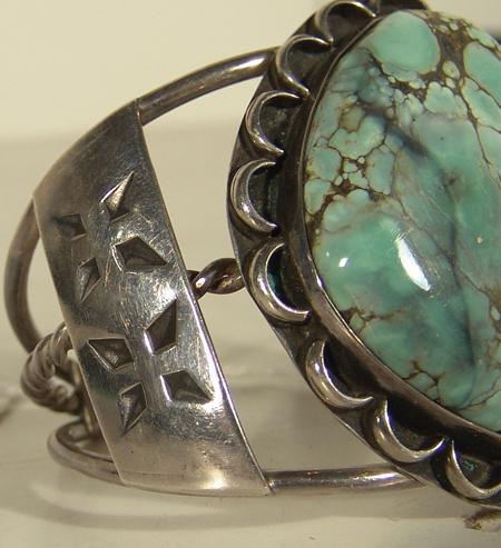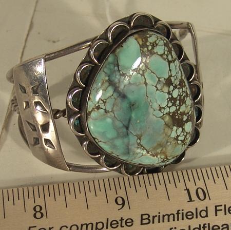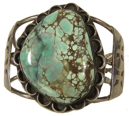Classic large stone turquoise and silver bracelet with solid stamped designs on sides. Condition: very good. 5-1/4" plus 1-1/8" gap x 2-1/8" wide.