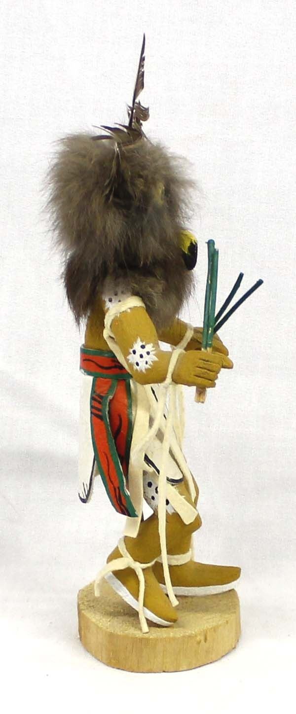 Navajo Brown Owl Kachina by Lucy and Jimmy Day, measures 9'' x 4'' and is signed on the bottom, embellished with feathers, leather, rabbit fur, and painted cloth