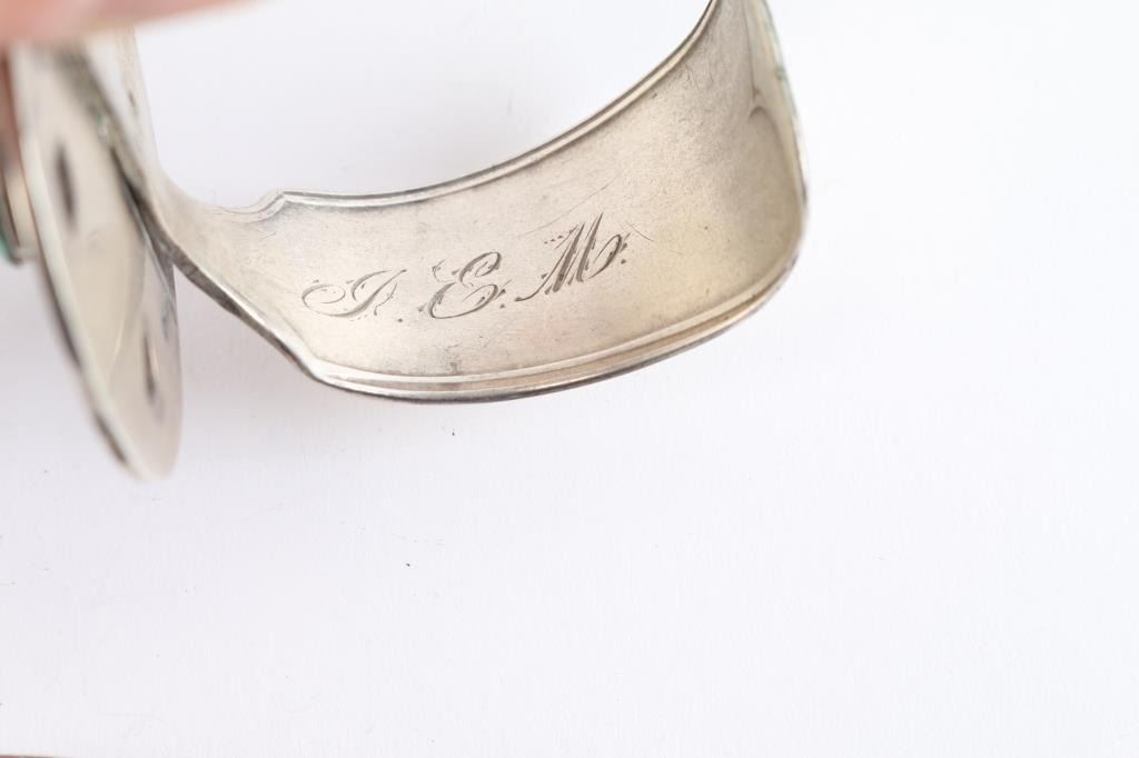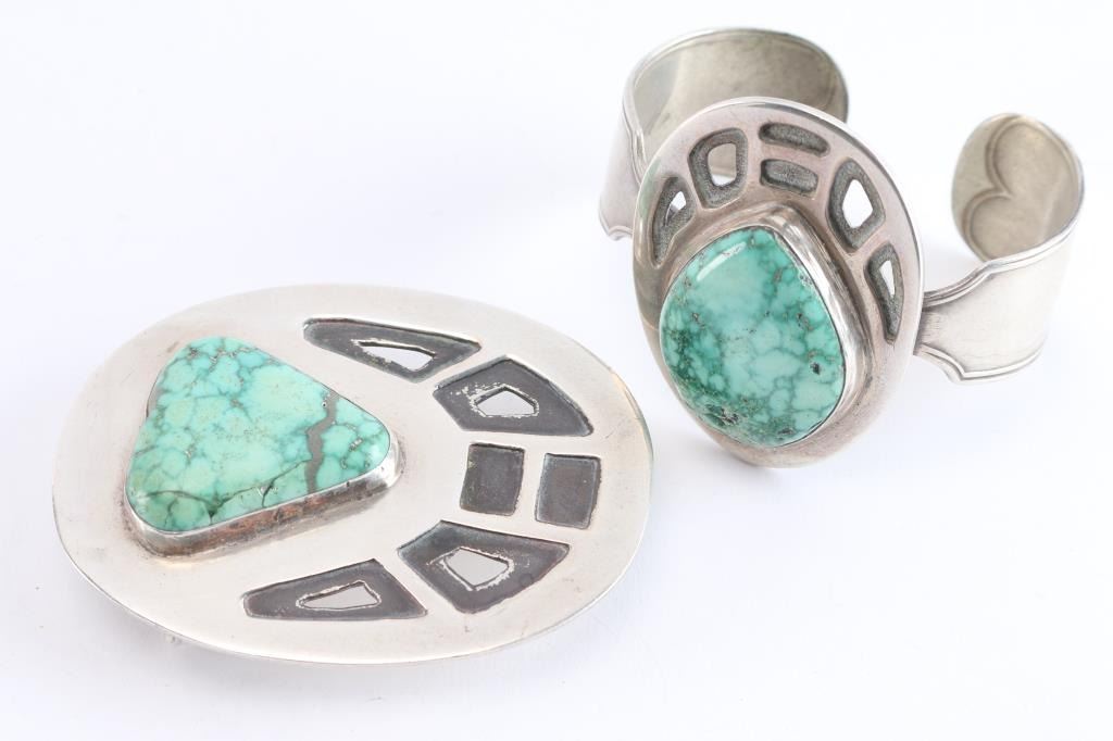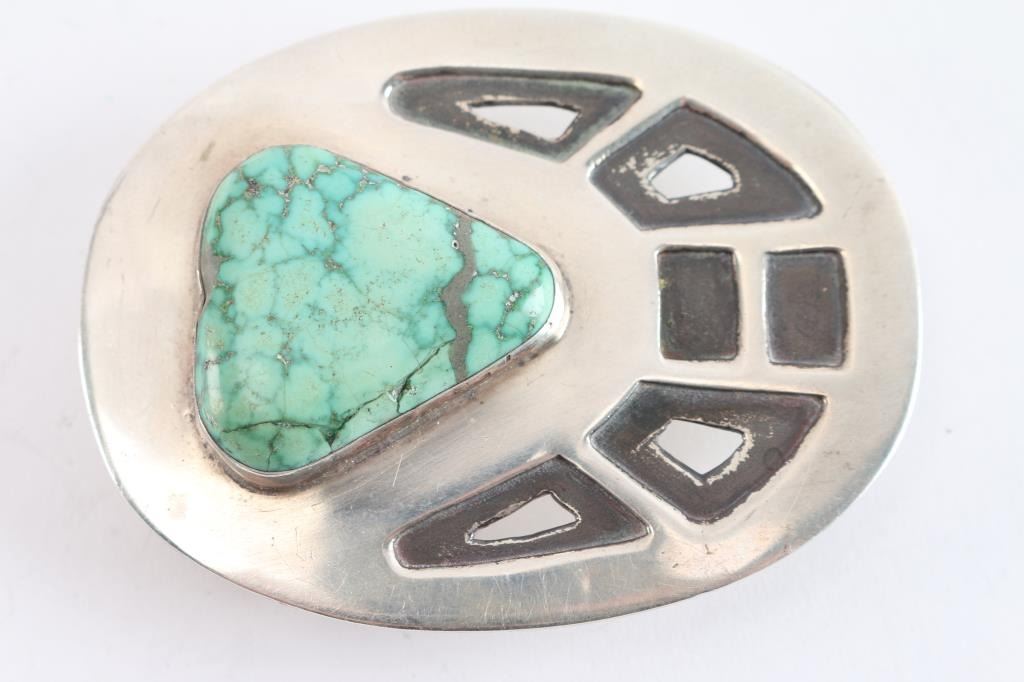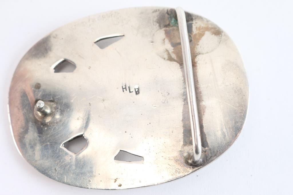 Sterling and turquoise buckle marked HLB with matching cuff, band is constructed of a sterling silver spoon handle, with monogram in interior.