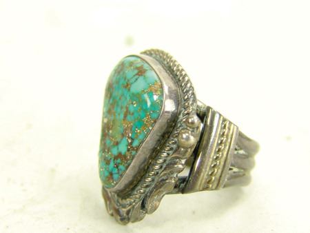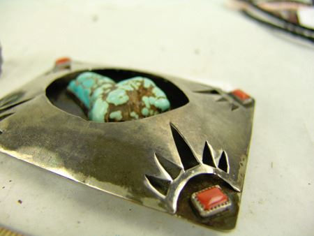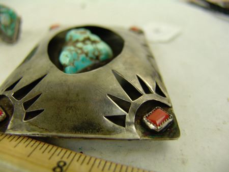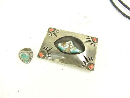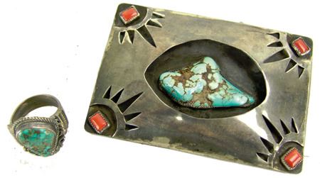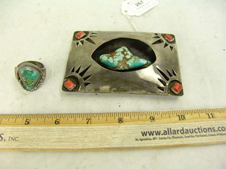 Ca. 1960s-1970s, Large and impressive all-silver shadowbox buckle with cutouts, coral, and a large turquoise nugget, plus a ring with turquoise nugget stone. Buckle 4-1/4" x 3", ring size 13