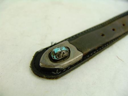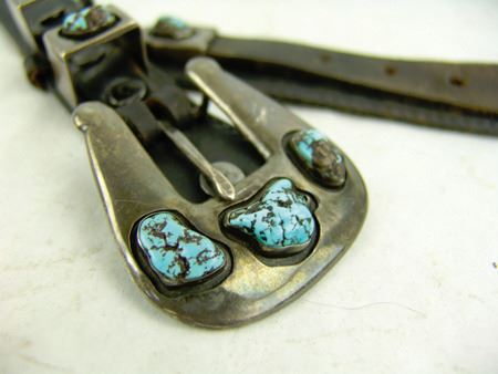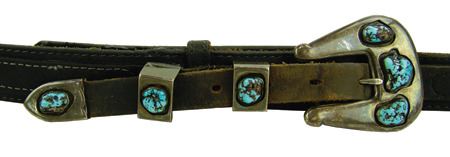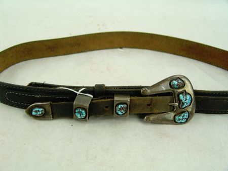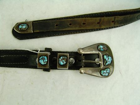 Ca. 1930s, Hand wrought all-silver shadowbox buckle with matching top and two keepers, all with matching black matrix turquoise nugget stones. Very good condition, great patina. On vintage leather belt. Unsigned. 43" x 1-1/4"
