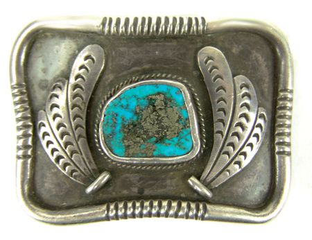 Mid 1900s, Classic handwrought vintage all-silver buckle with a single turquoise stone. Very good condition. 2-1/8" x 3"