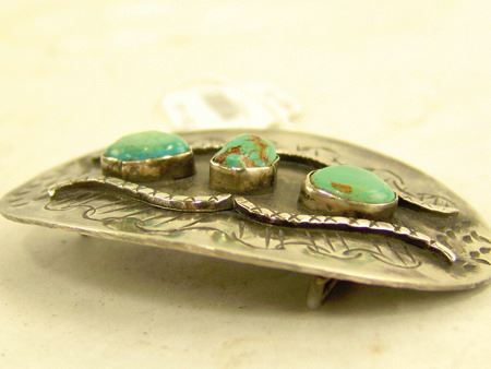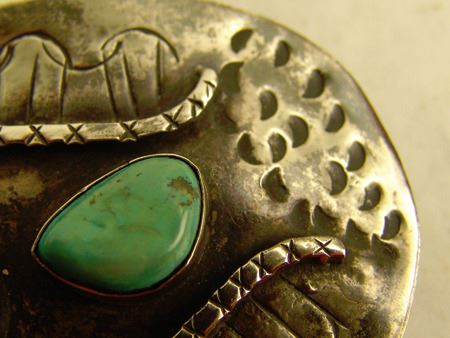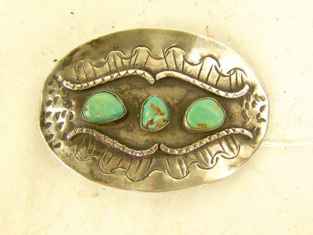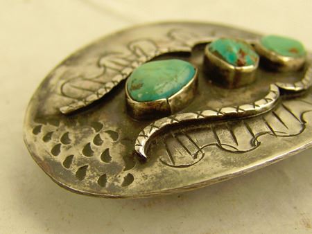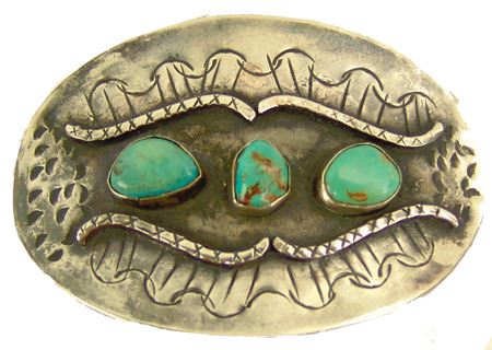 Ca. 1960s, Vintage all-silver oval belt buckle with intersting stampwork and raised snake(?) figures plus three green turquoise stones. Very good condition. 2-1/4" x 3-1/4"