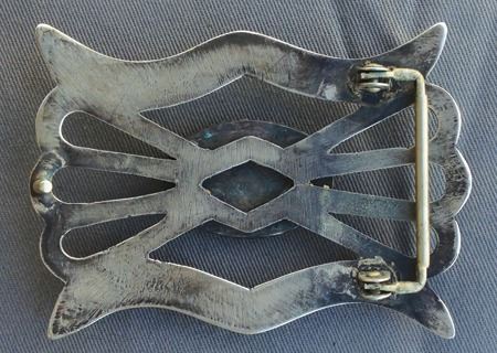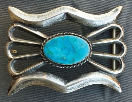 Ca. 1950s-1960s, Wonderful vintage sand cast solid silver buckle with single turquoise stone in rope bezel. Very good condition. Fits up to 1-1/2" wide belt. 3-1/2" x 2-1/2"