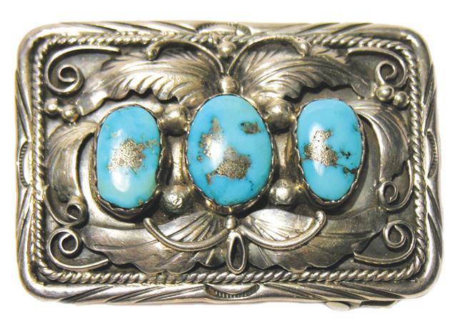 Circa 1970s, Beautiful repoussé work bracelet with three natural turquoise cabochons with fine matrix - hallmark P. FNE-STC. 1-3/4" x 2-1/2"
