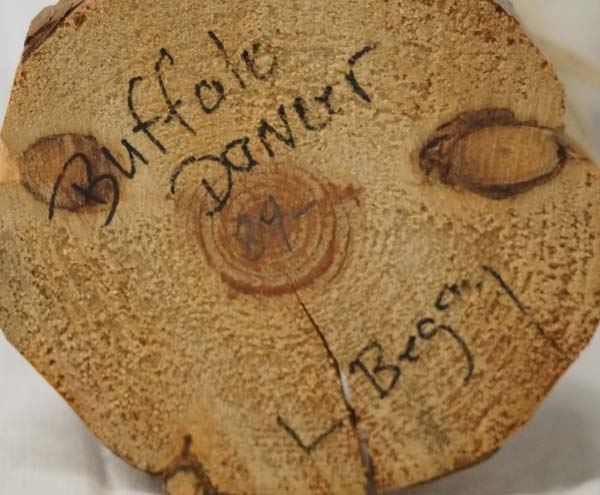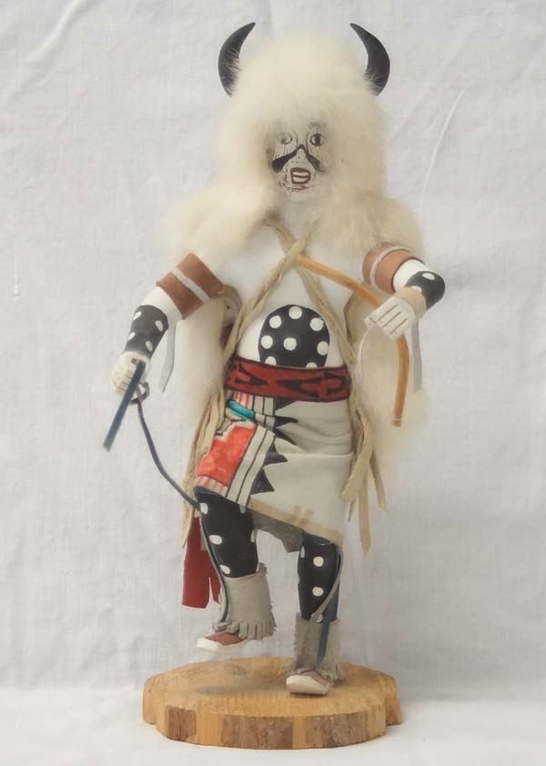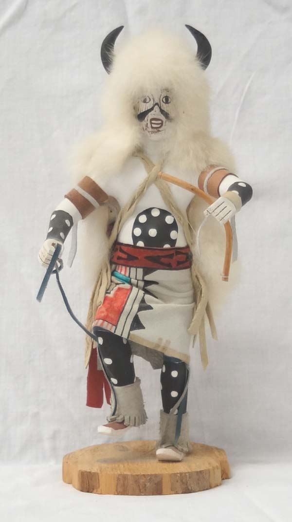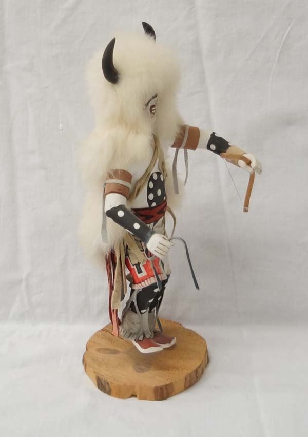 Native American Navajo Buffalo Kachina Dancer by L. Begay, measures 11'' x 4'' x 4'', embellished with leather, rabbit fur, signed on bottom by artist