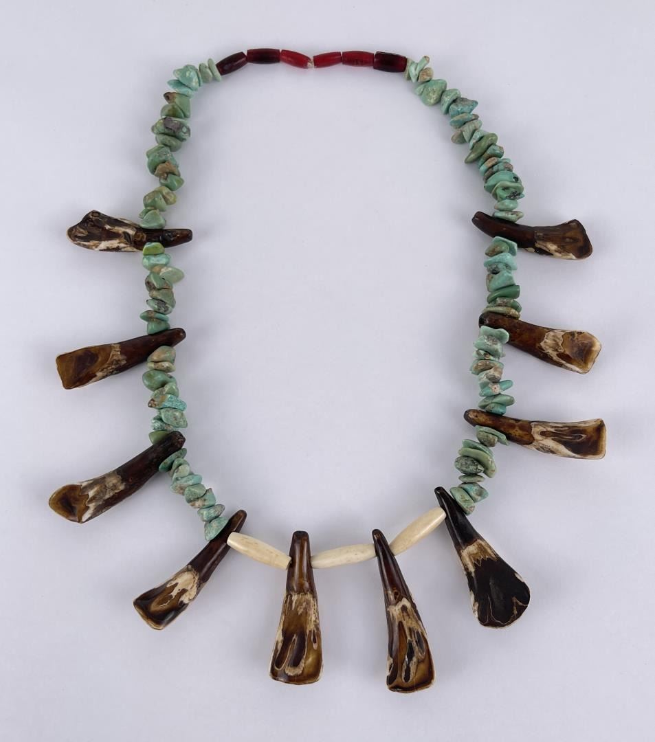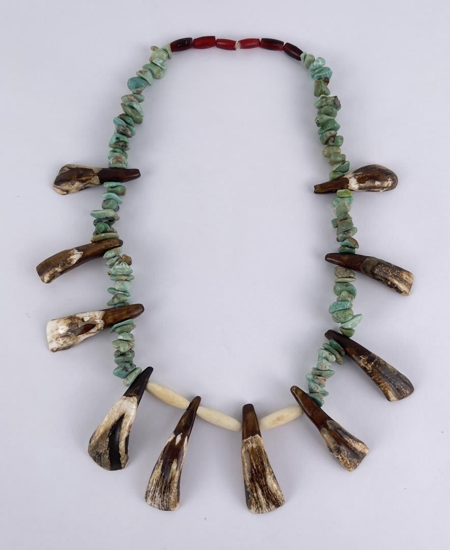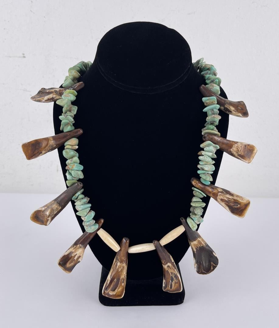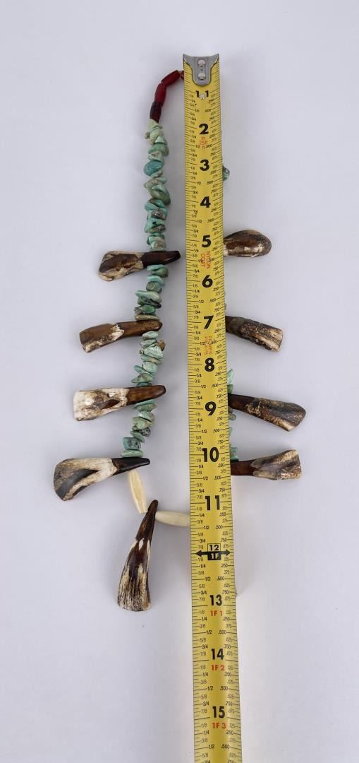 Very nice necklace. Turquoise, buffalo teeth, and bone hair pipe.