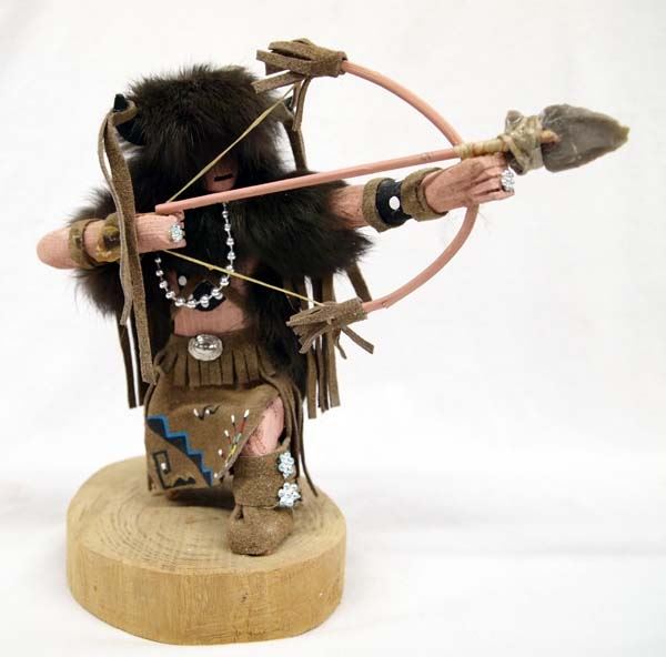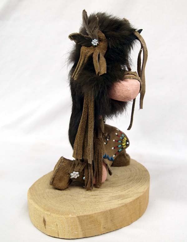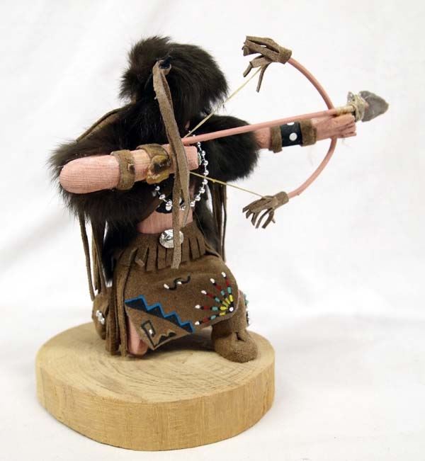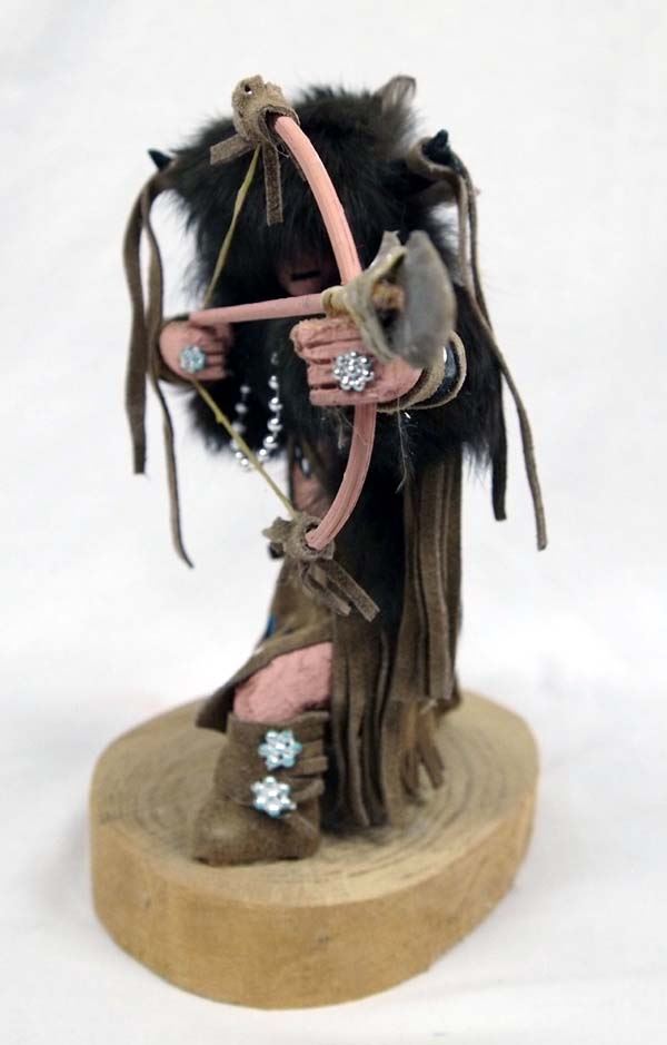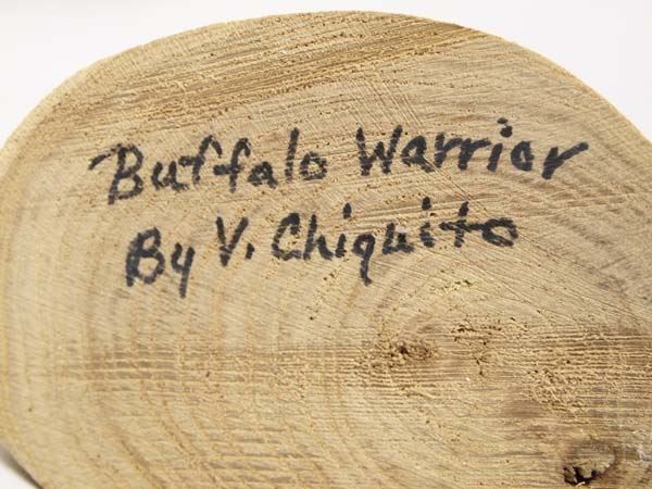 Native American Navajo Buffalo Warrior Kachina by V. Chiquito, measures 8.5'' x 9'', mounted on wood base, artist signed, embellished with rabbit fur, leather, and beads, arrow is equipped with stone arrowhead