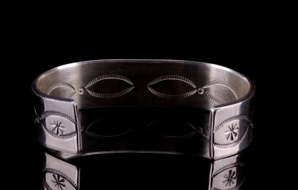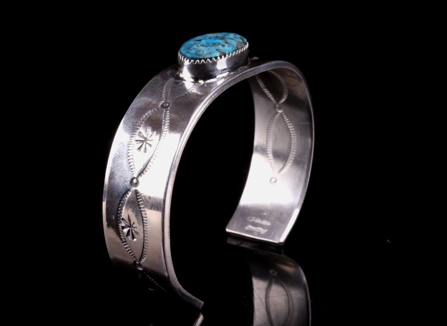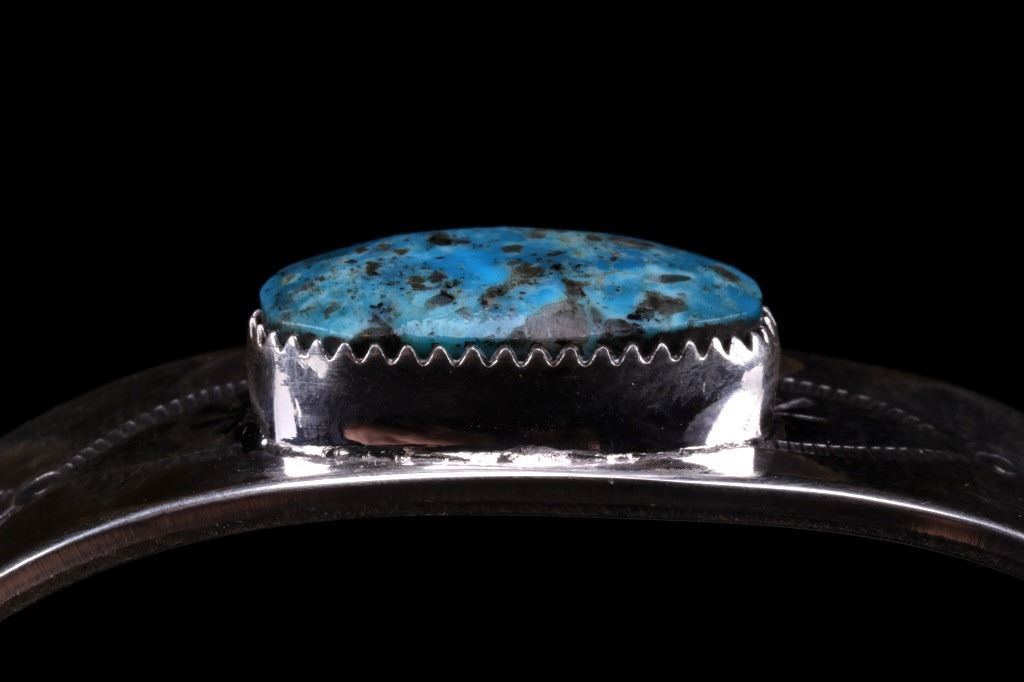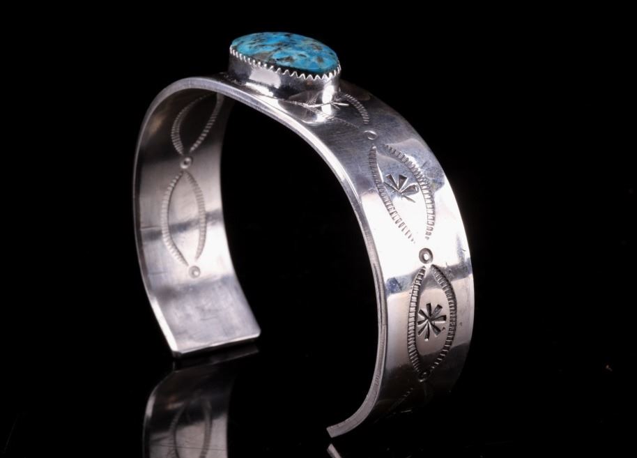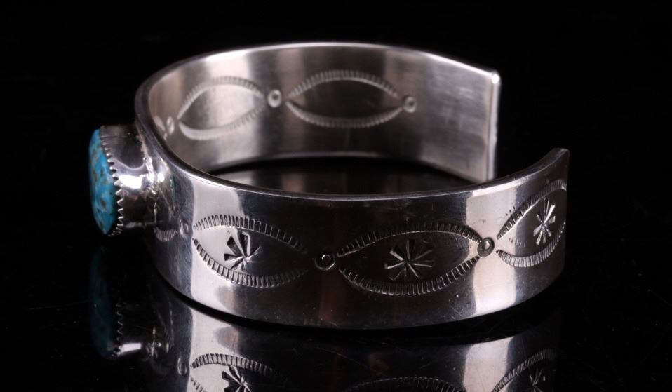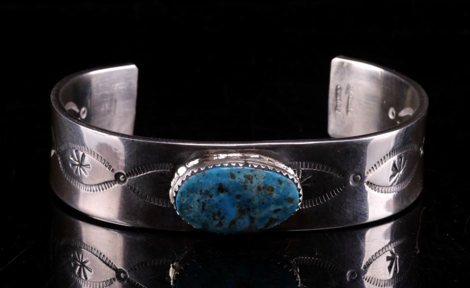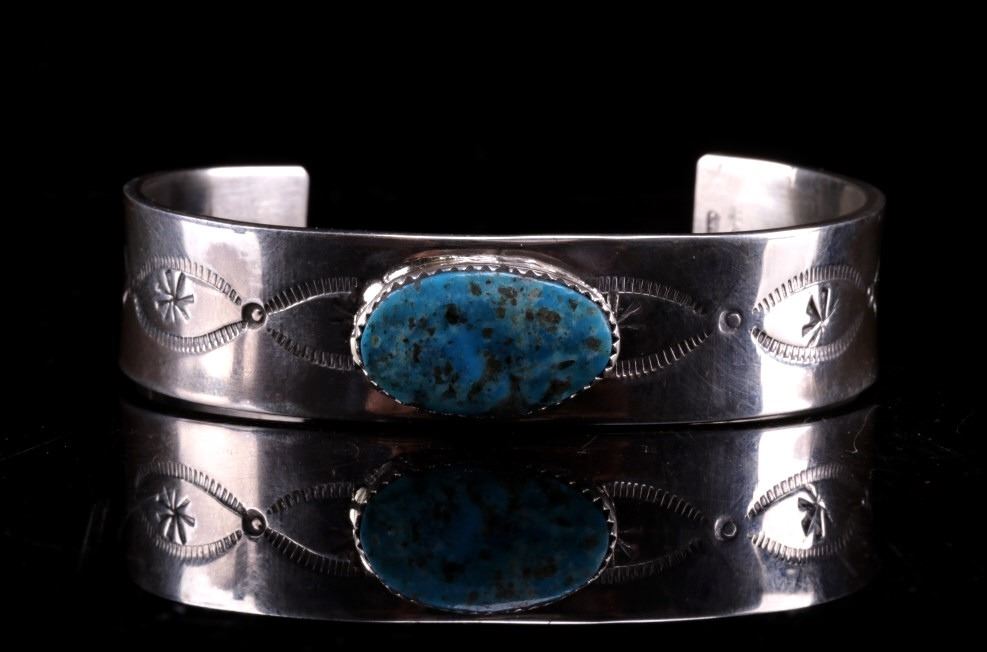 Featured in this lot is this Navajo, C.J. Butler Cripple Creek turquoise and sterling silver bracelet. This beautiful bracelet features a large Cripple Creek turquoise oval cabochon centered on the bracelet with stamped and textured face, stamped eyes, and eight point stars in the center. The bracelet shows stamped decoration on the underside of the bracelet, with the artist’s hallmark shown on the underside of the bracelet. The condition of this bracelet is good, with no obvious signs of damage. The measurements of this bracelet are 2 1/4" x 2 3/4" x 5/8" and the circumference measures 5". The weight of this bracelet is 55.3g.