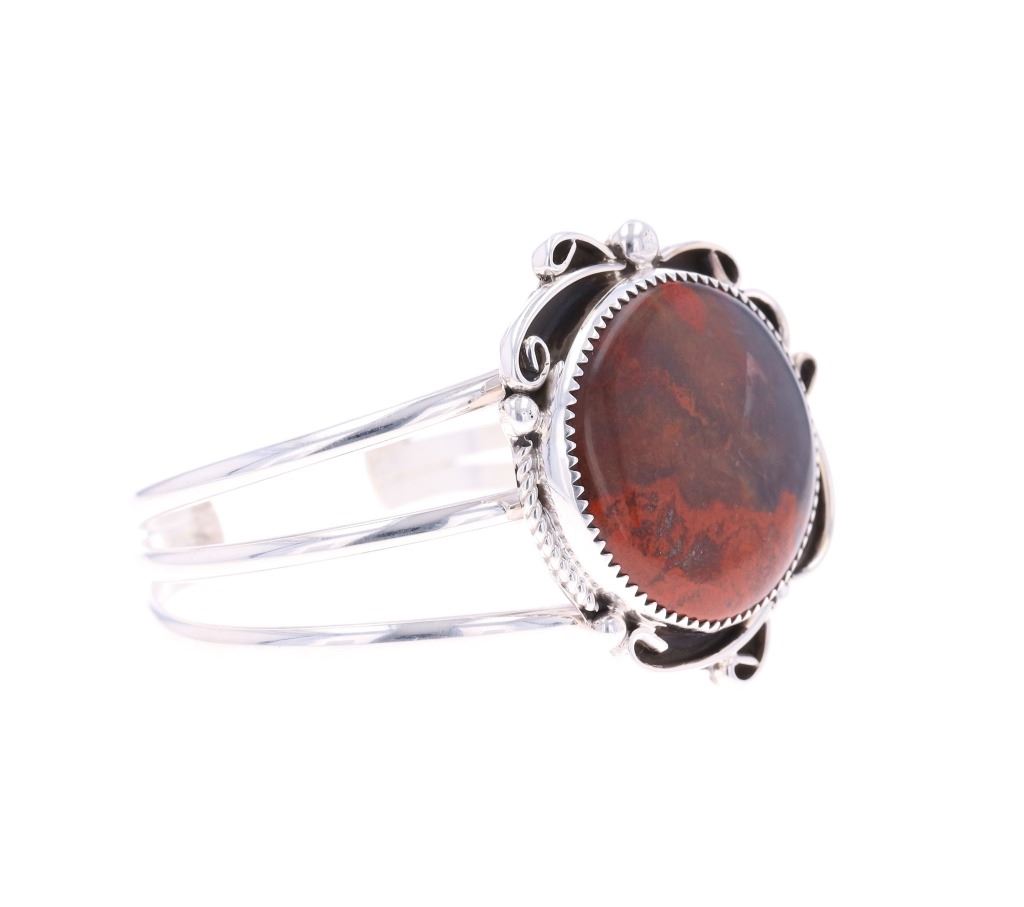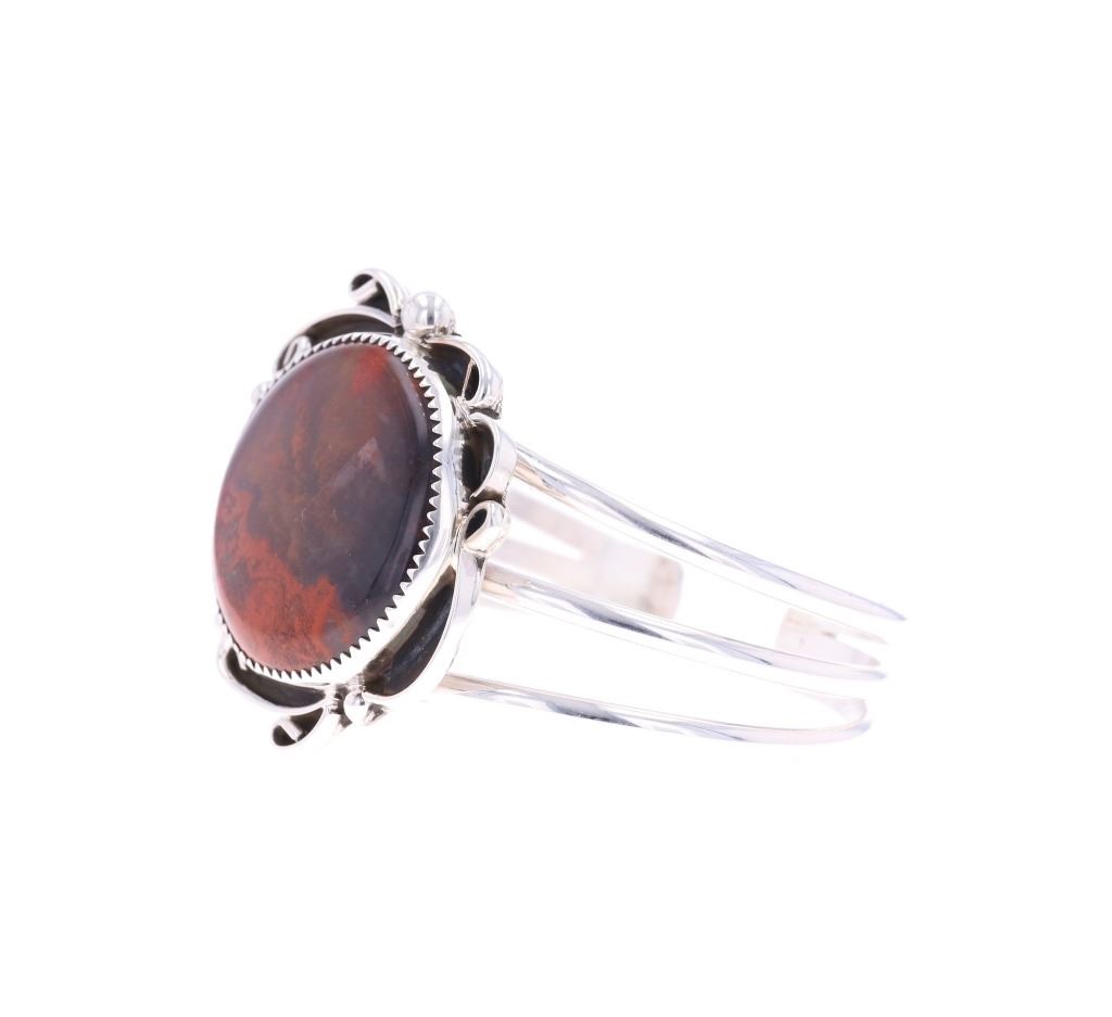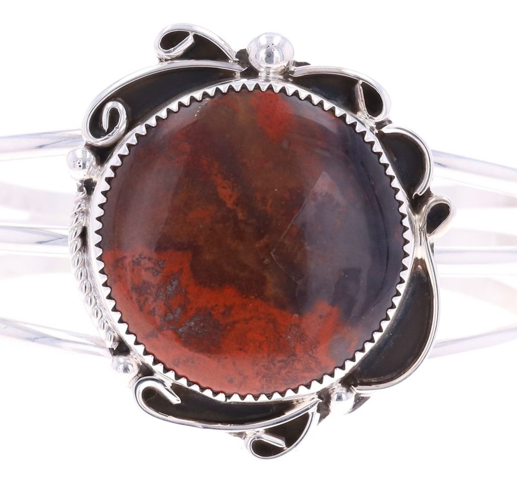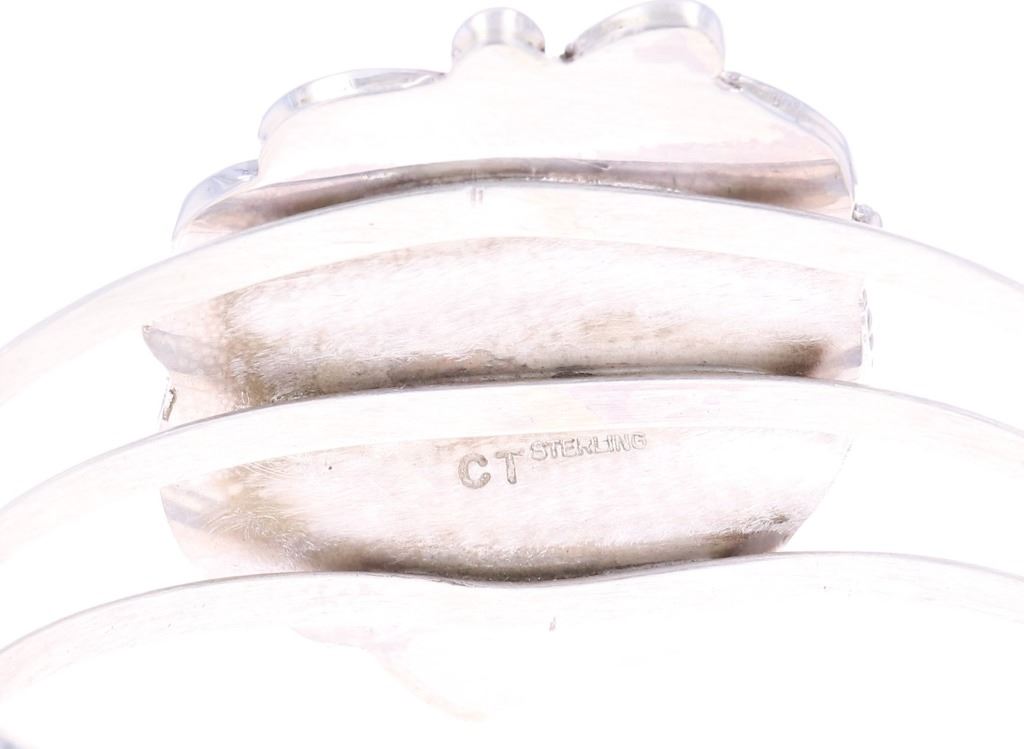 Featured in this lot is this sterling silver Coprolite bracelet from Navajo artist Calvin Tom. The bracelet features a wonderfully and professionally crafted sterling silver and Coprolite construction that shows a triple split frame with a sterling silver setting that shows ribbons and a section of twisted rope decoration. The center stone is a round Coprolite cabochon that shows brown with red coloration. The bracelet is marked as follows: CT - Sterling. The condition of this Navajo bracelet shows good overall condition with no obvious signs of damage and shows good overall condition. The measurements of this bracelet is 2" x 2 3/8" x 1 1/2" and shows a circumference of 5". The collective weight of this bracelet is 33.4g.