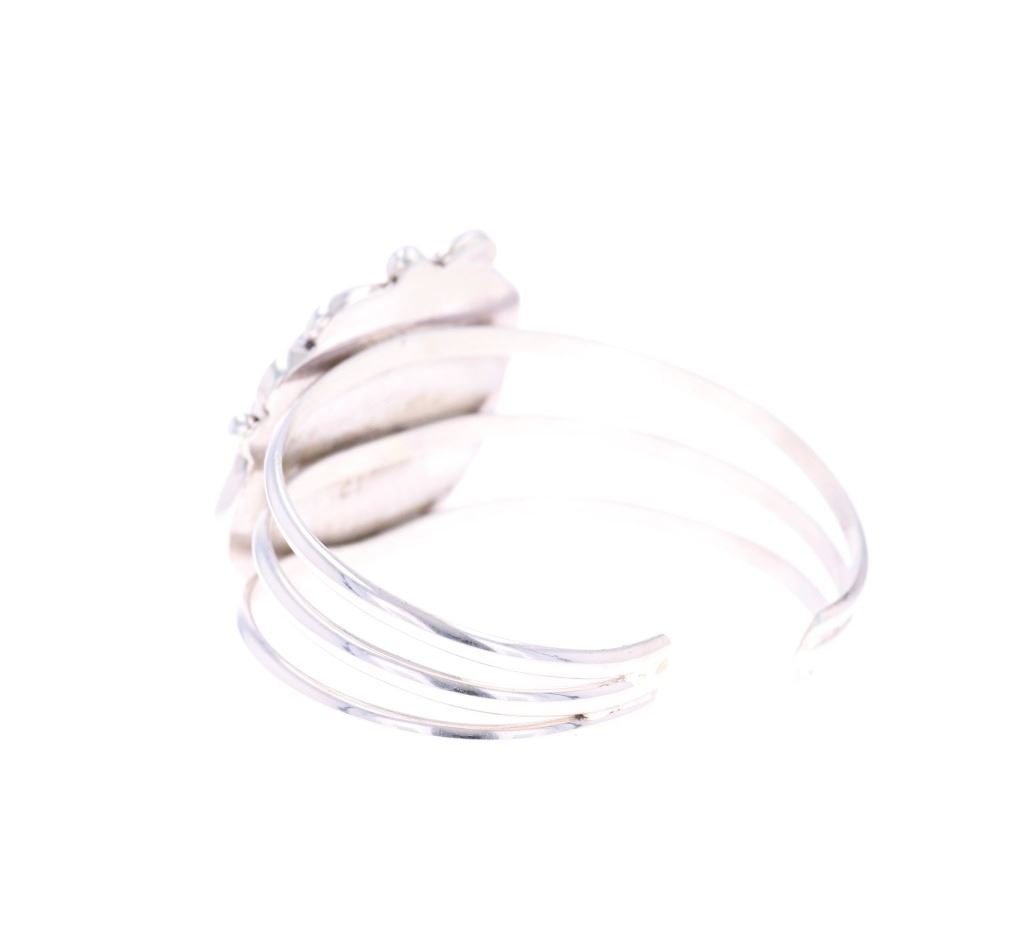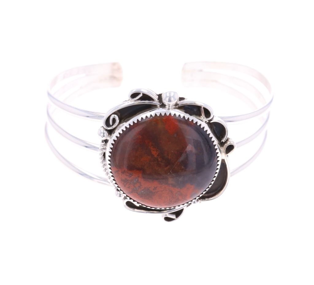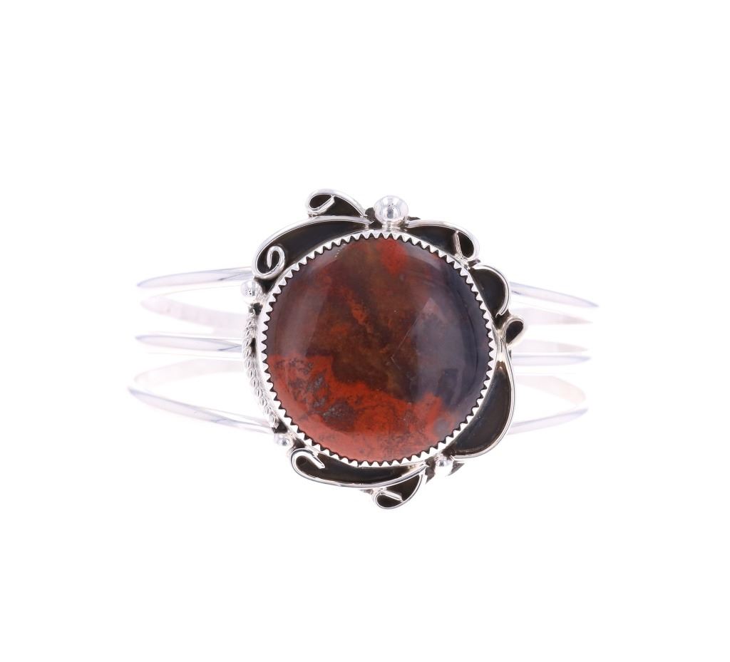Featured in this lot is this sterling silver Coprolite bracelet from Navajo artist Calvin Tom. The bracelet features a wonderfully and professionally crafted sterling silver and Coprolite construction that shows a triple split frame with a sterling silver setting that shows ribbons and a section of twisted rope decoration. The center stone is a round Coprolite cabochon that shows brown with red coloration. The bracelet is marked as follows: CT - Sterling. The condition of this Navajo bracelet shows good overall condition with no obvious signs of damage and shows good overall condition. The measurements of this bracelet is 2" x 2 3/8" x 1 1/2" and shows a circumference of 5". The collective weight of this bracelet is 33.4g.