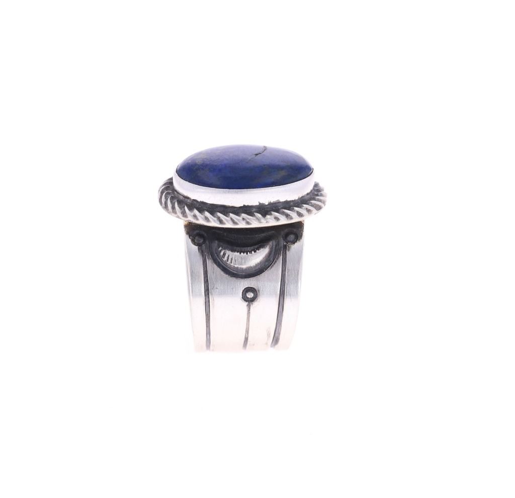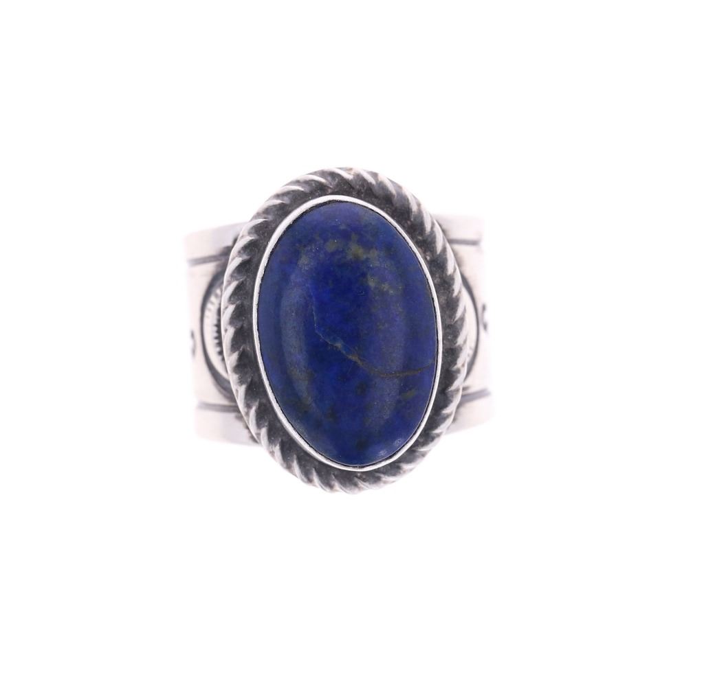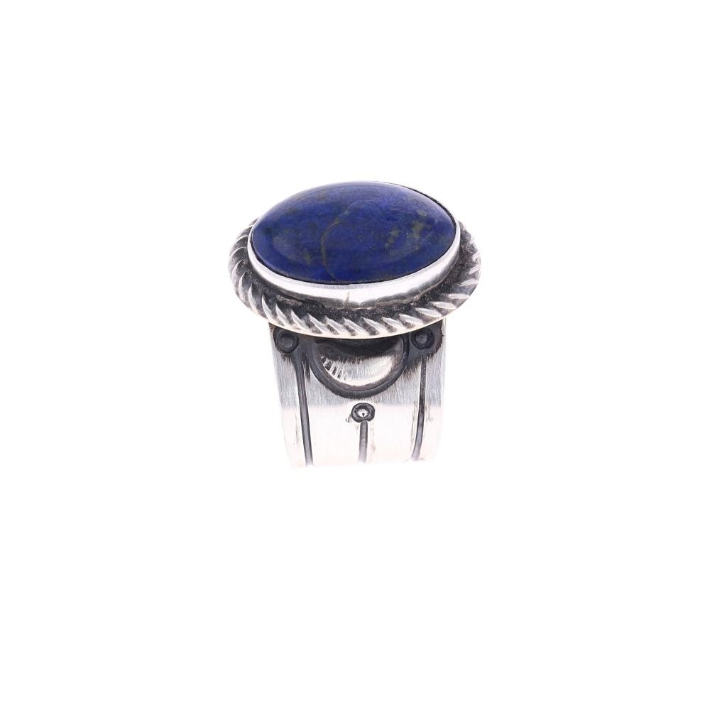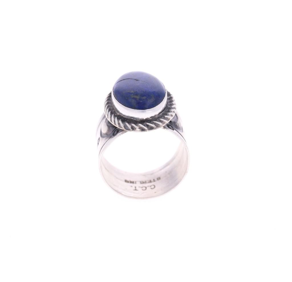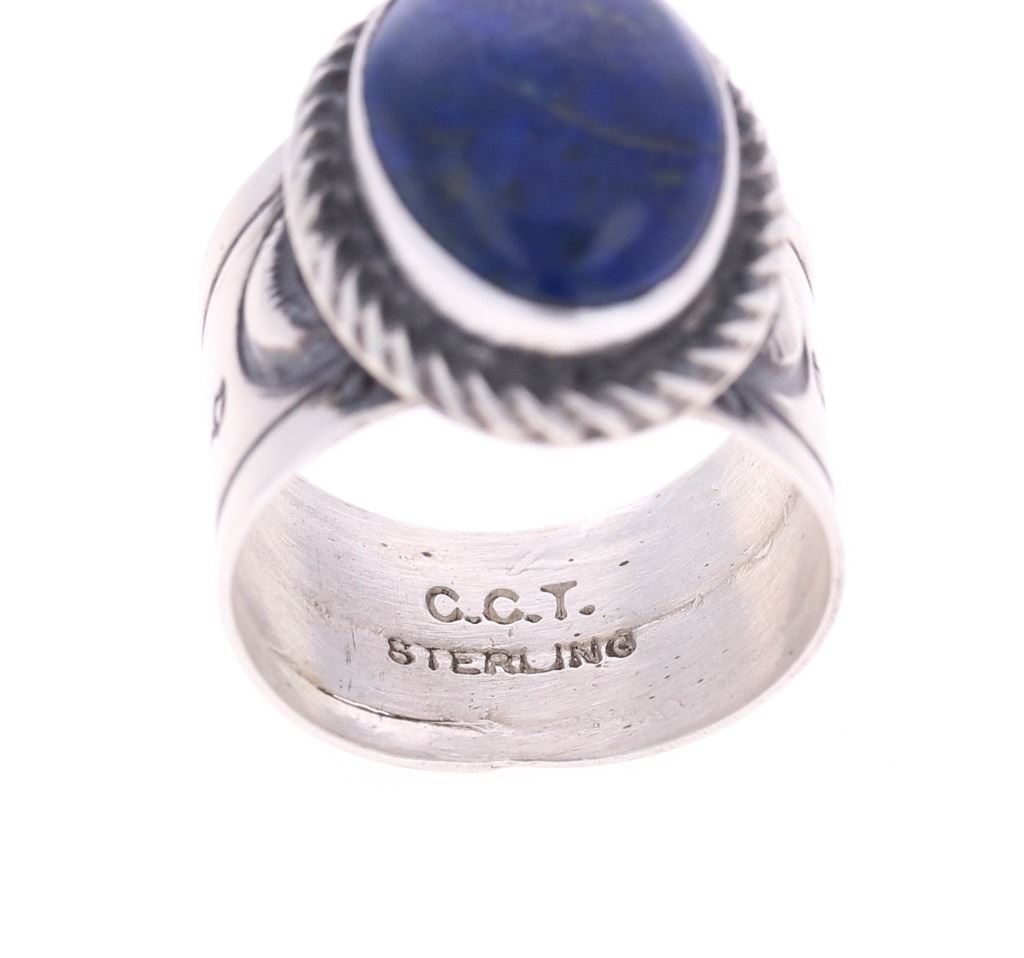 Featured in this lot is this sterling silver and lapis lazuli ring from Navajo artist Chaz Tsosie. The ring features a wonderfully and professionally crafted sterling silver and lapis lazuli construction that shows a embossed and stamped sterling silver decoration with a twisted rope border and a large oval cut lapis lazuli stone set into the center. The ring is marked as follows: CCT - Sterling. The condition of this Navajo ring is good with no obvious signs of damage and shows good overall condition. The measurements of this ring is 1 1/4" x 7/8" x 7/8" and the ring size is US 11 1/4. The collective weight of this ring is 11.6g.