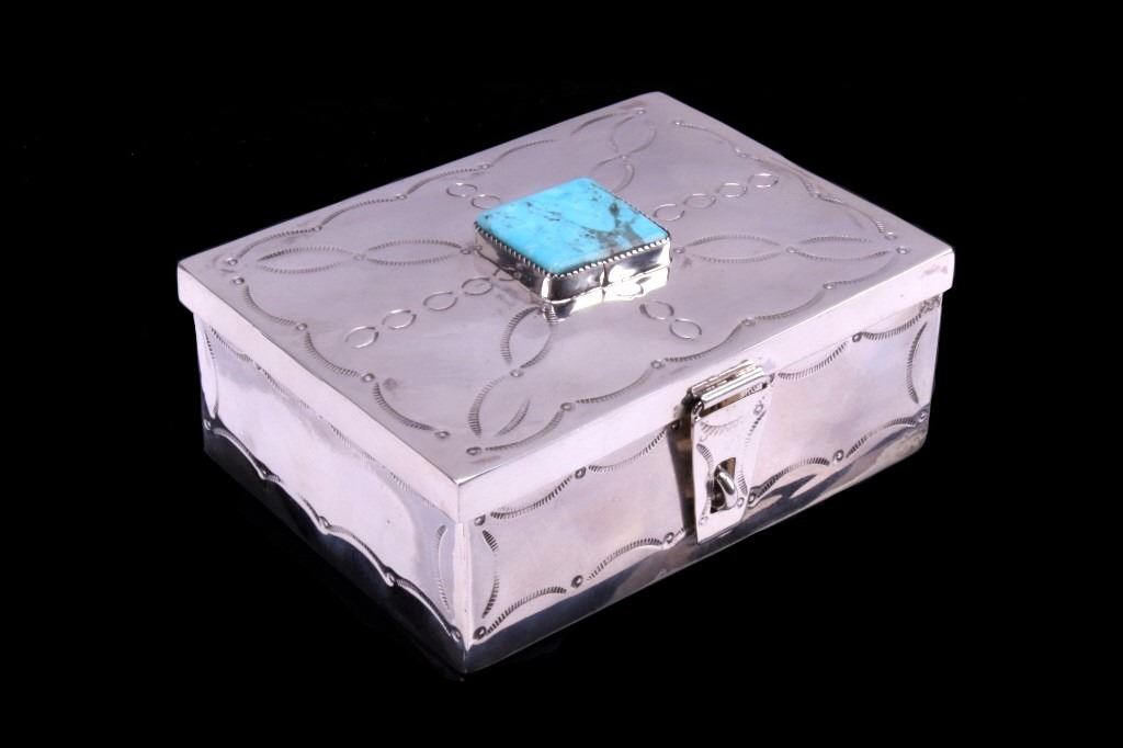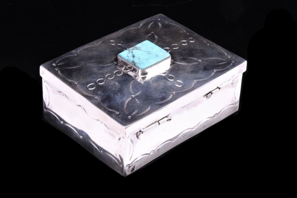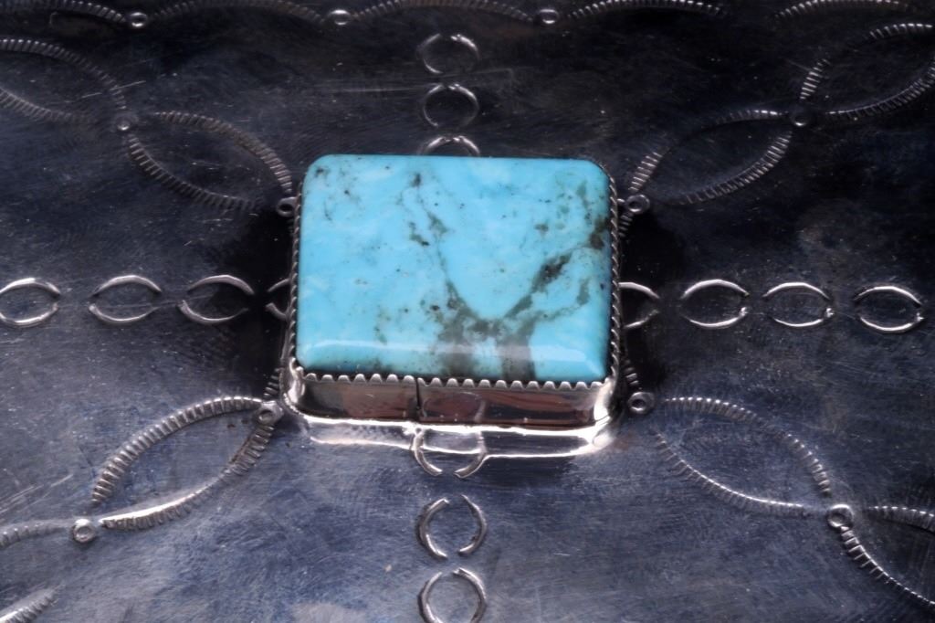 For your consideration is a fantastic Navajo Native American, sterling silver and turquoise box. This box has an amazing finish and styling that resembles the Navajo stamp work of the early 1900’s. On the top is a nice size, polished cabochon of Stormy Mountain turquoise, showing a blue-green coloring with black host matrix, bezel set into the silver. The top of the box has a nice, curved finish with heavy stamping and is hinged, revealing a patina’d silver inside. The outside of the box has a similar heavy stamped finish to match the extended lid and is finished by four triangular feet. The piece has a heavy construction for its size and is crafted of sterling silver. The box measures 3” x 2” x 1 ¾” when the lid is closed.