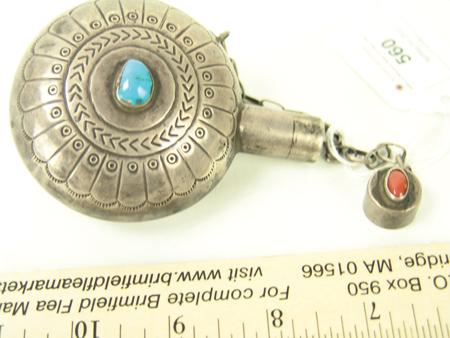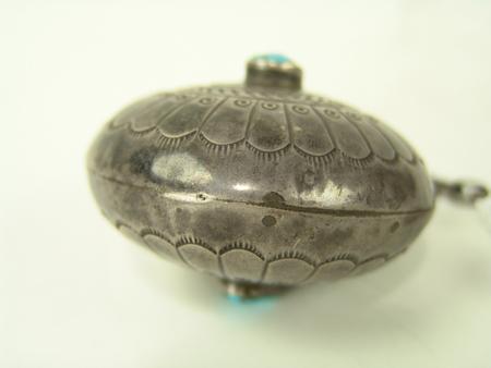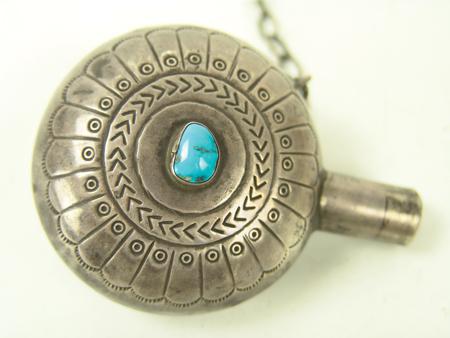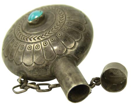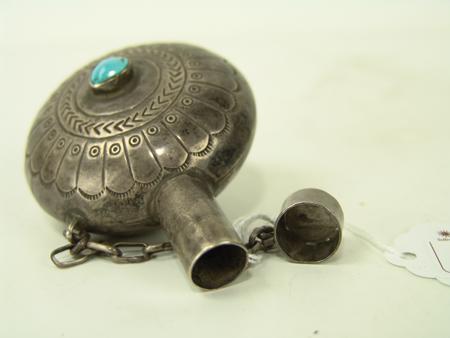 Circa Mid 1900s, Fine traditional style hand wrought silver tobacco canteen with chained cap, feather design, and single turquoise stone on both sides. Very good condition, nice patina. 3-1/2" x 2-5/8"