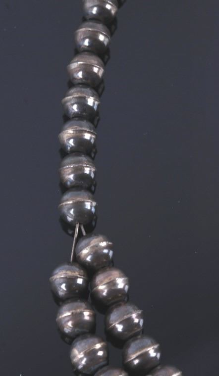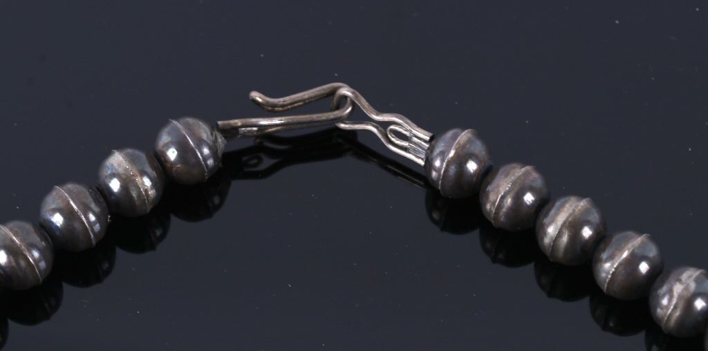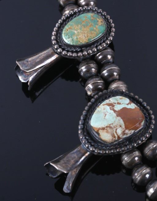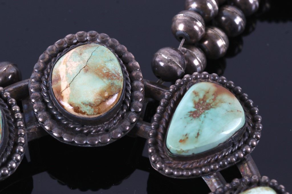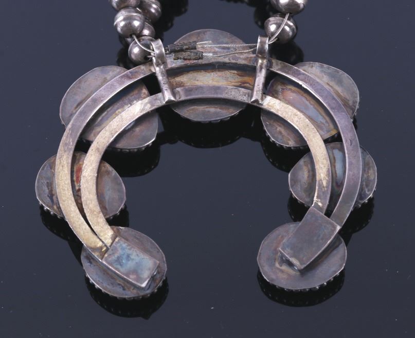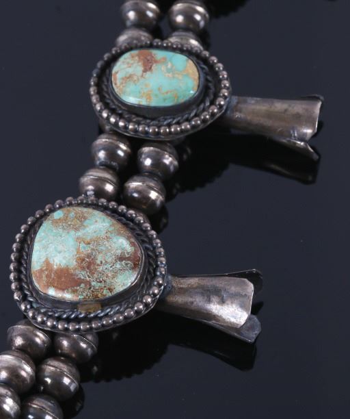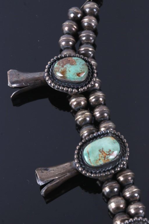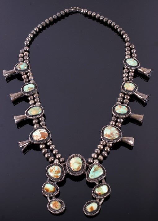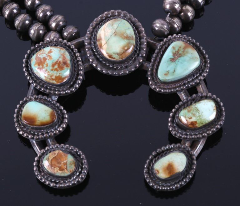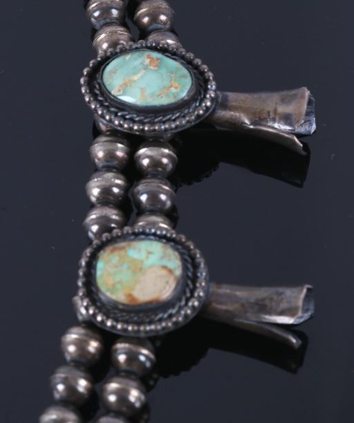 This is a Navajo Native American Indian sterling silver and Carico Lake turquoise squash blossom necklace. This Old Pawn Jewelry squash blossom features a beautiful naja flanked on either side by four blossoms. Each blossom is adorned with a gem quality polished turquoise nugget from the renowned Carico Lake Turquoise Mine and each pendant is strung onto a sterling silver bead chain. The Navajo squash blossom necklace is in good condition. The piece shows dozens of round concho silver beads in a double strand. This necklace has an impressive style and early 1900's age. The naja measures 3 1/8" x 3 1/4".