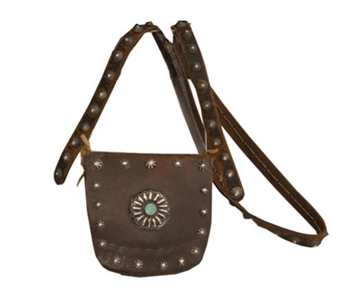 Navajo Carrying Bag. 25 1/2". Pouch 6" x 6". Silver buttons and turquoise on old hide. Excellent condition. (est $1,000-1,500)