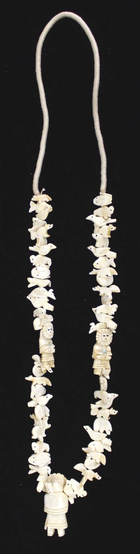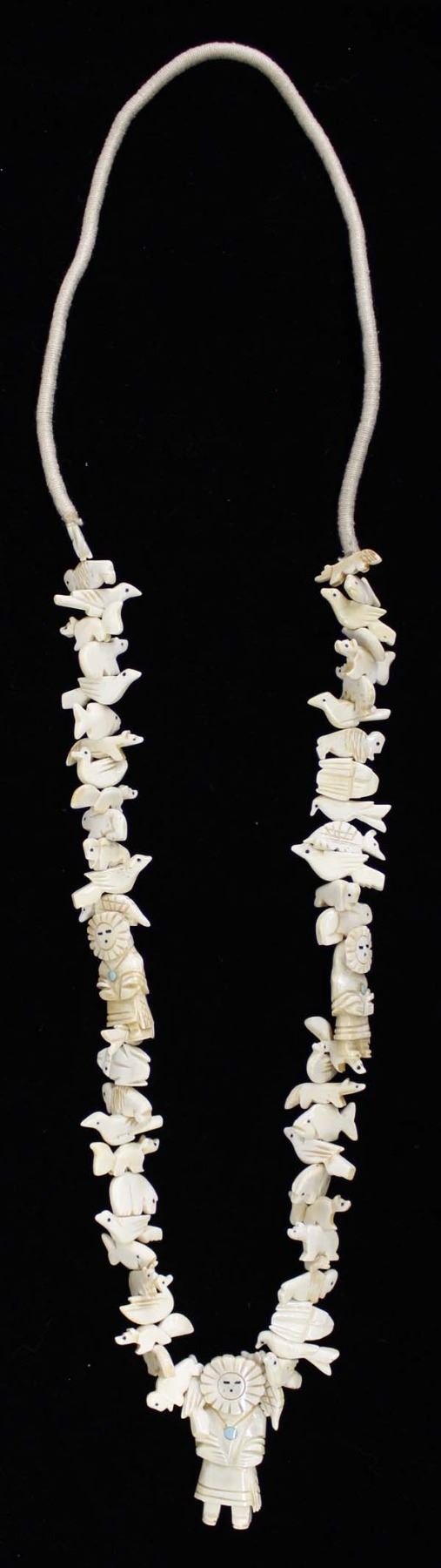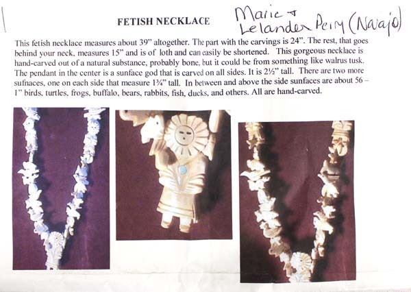 Native American Navajo Carved Buffalo Bone Stacked Fetish Necklace by Marie and Lelander Perry, measures 38''L end to end, Sun Maiden Pendant measures 2.5'' x 1'', embellished with turquoise, string wrapped