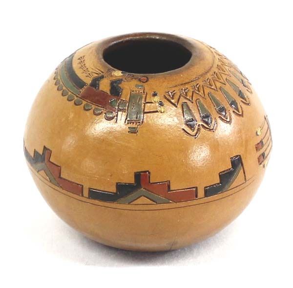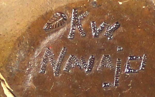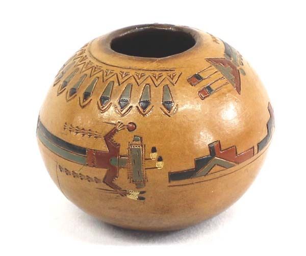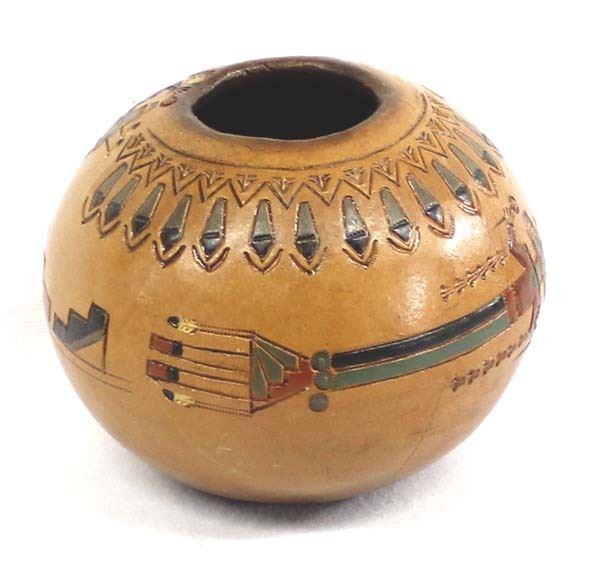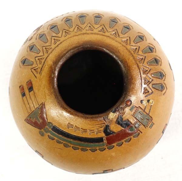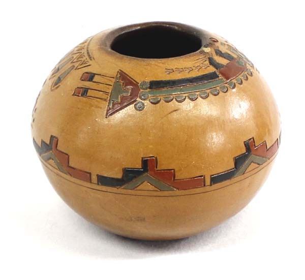 Beautiful Native American Navajo Carved Pottery Jar by Ken White, measures 4'' x 5'' and has artist's initials on the bottom, hand painted