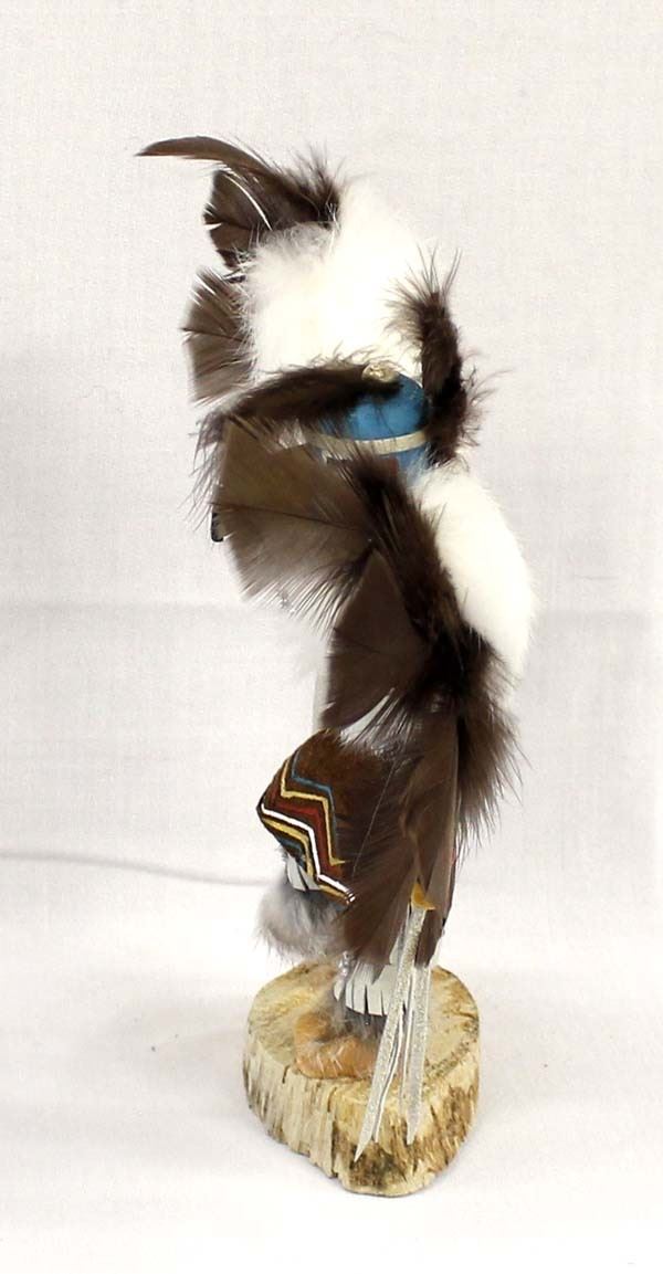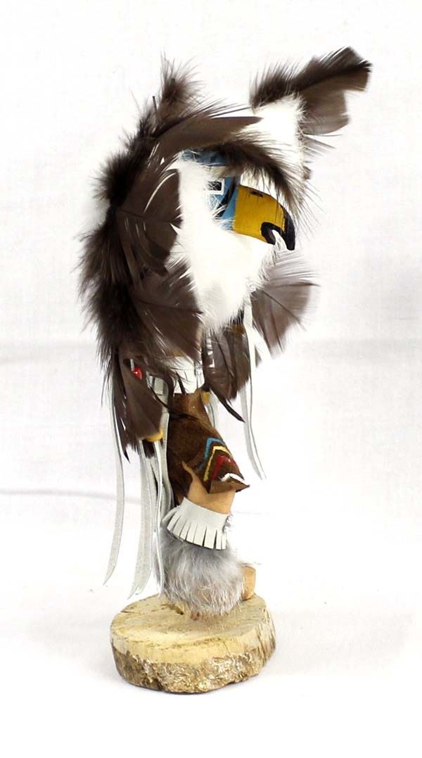 Brand New Native American Navajo Carved Wood Eagle Kachina by Alta Apachito, measures 11'' x 12'' and is embellished with feathers, rabbit fur, leather, and beads, beautifully carved and hand painted with exquisite details