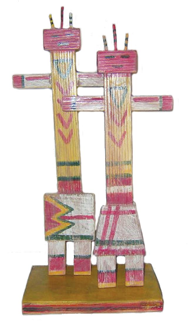 Contemporary, Painted Navajo-style wooden totem figure depicting a pair of Yeis. 15"