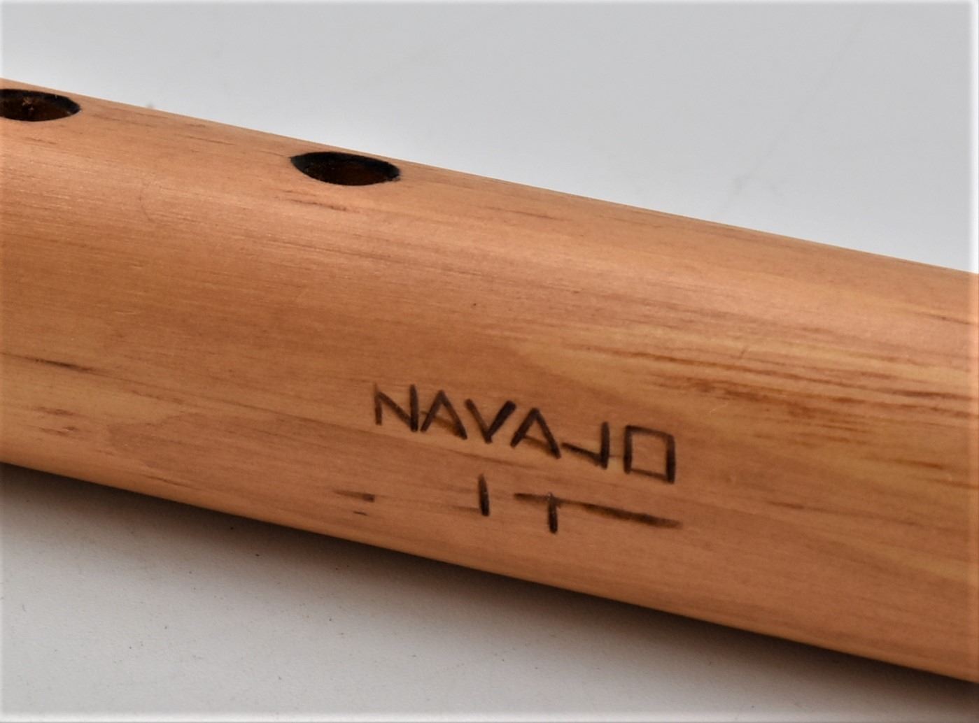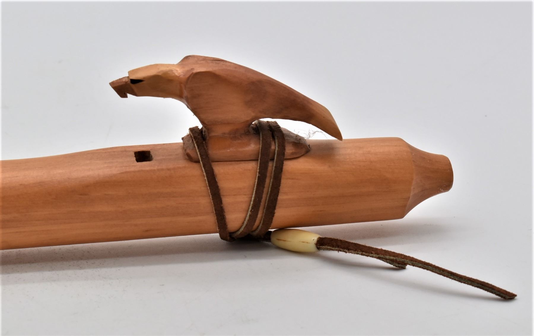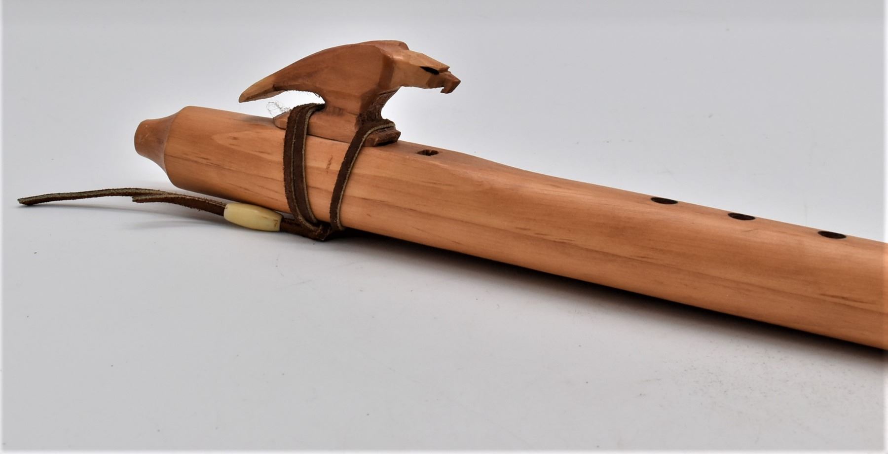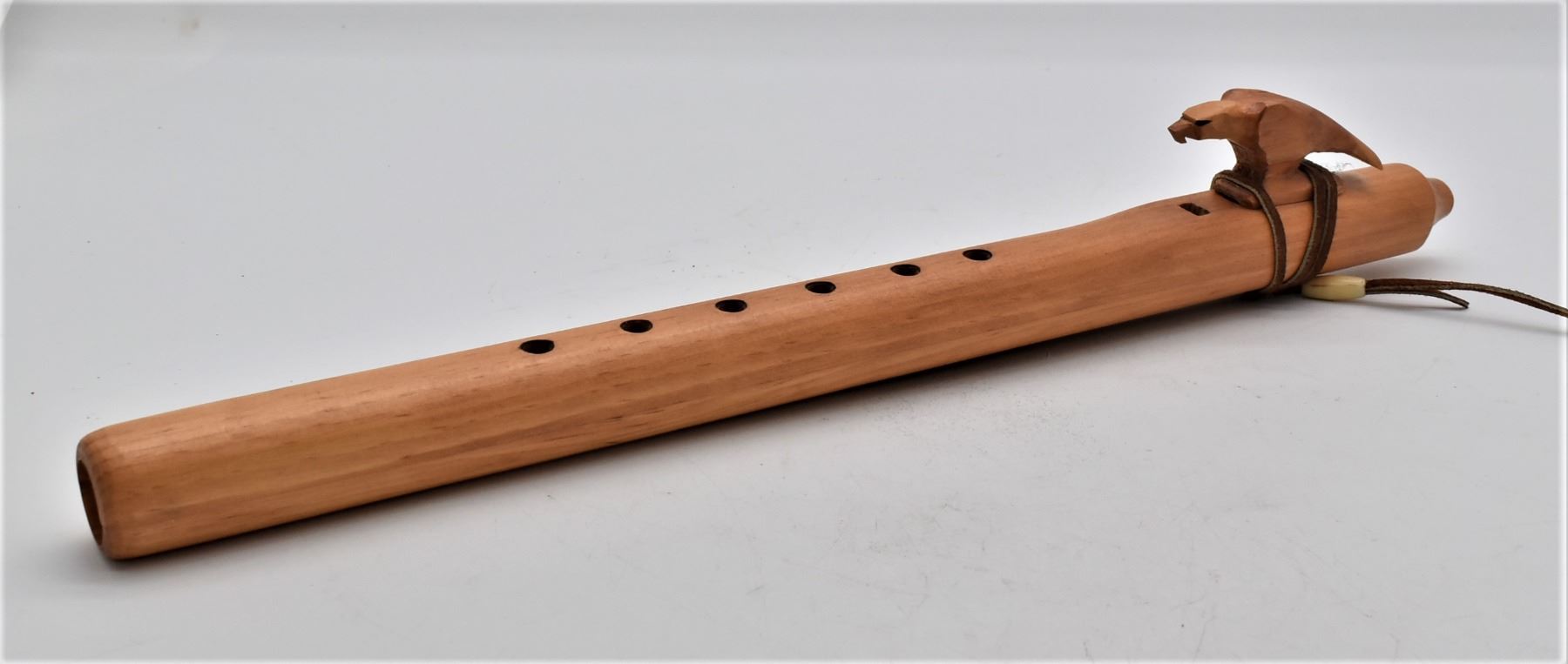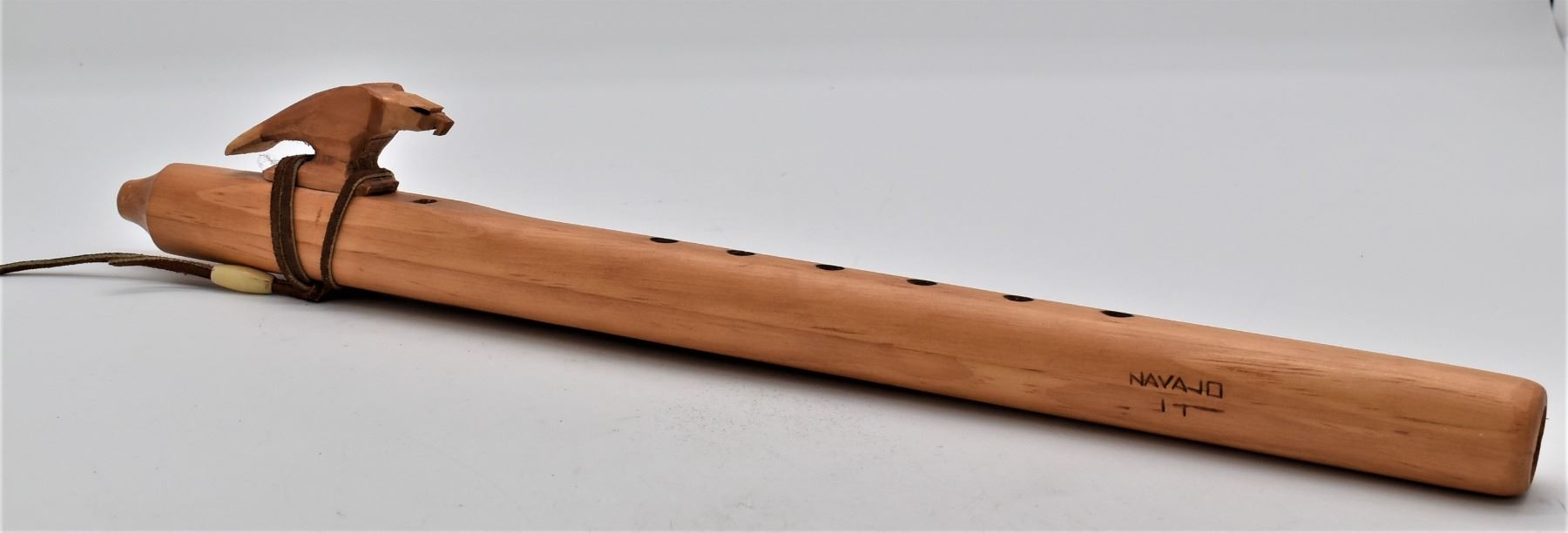 Native American Navajo Cedar Flute by Jonah Thompson, measures 17''L x 2.5''H x 1.25''D, artist's initials on end of flute, eagle block, embellished with leather ties and bone bead, like new condition