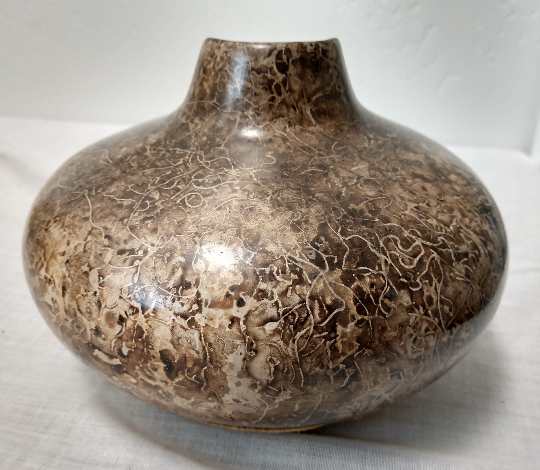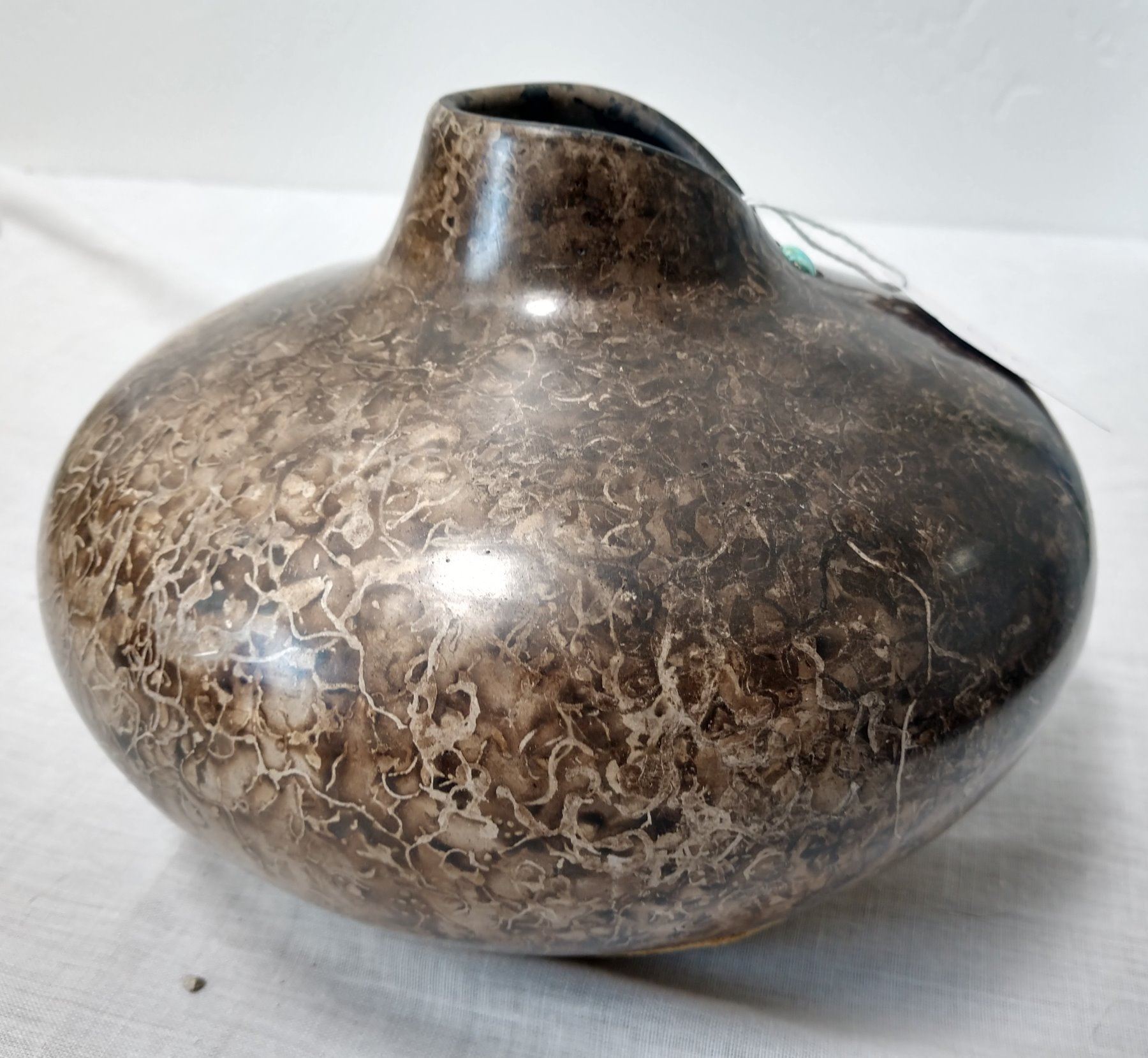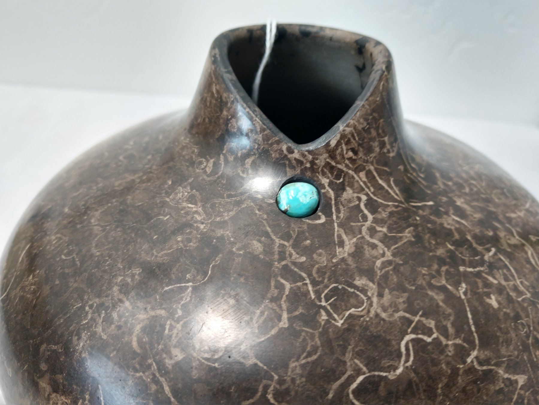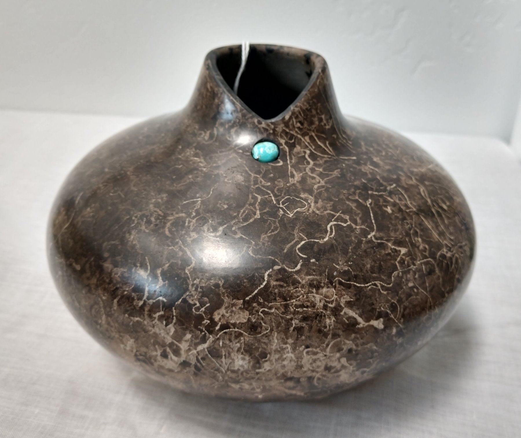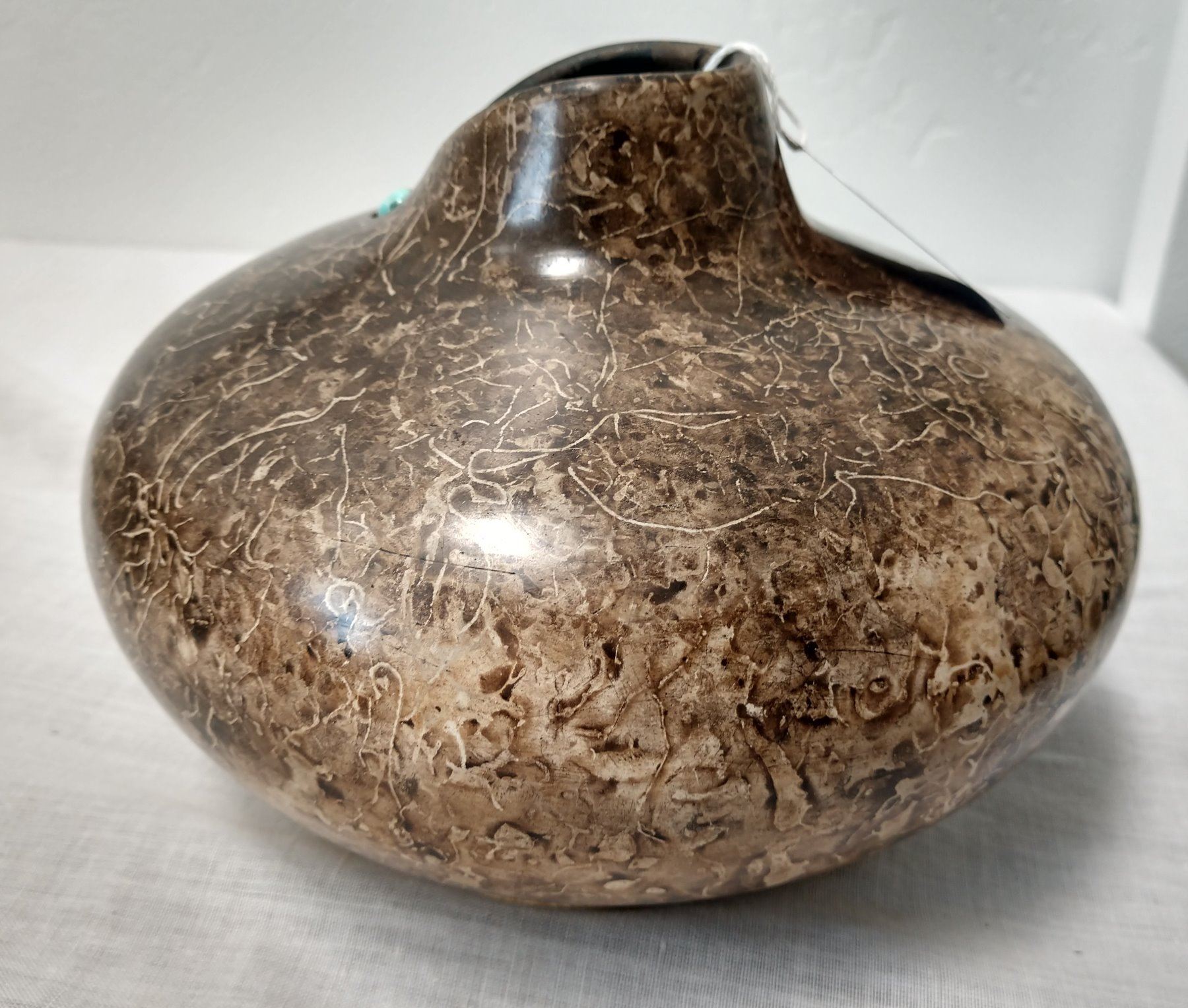 Navajo Ceramic Pot, 20th century item. Made of clay, horsehair, leather and turquoise, the item is 6" x 4". Navajo, southwest USA. Leather on bottom, signed. Cute turquoise stone; item resembles a woman's neck. Condition: Good, see images. Shipping: $18.50 w/insurance and signature.