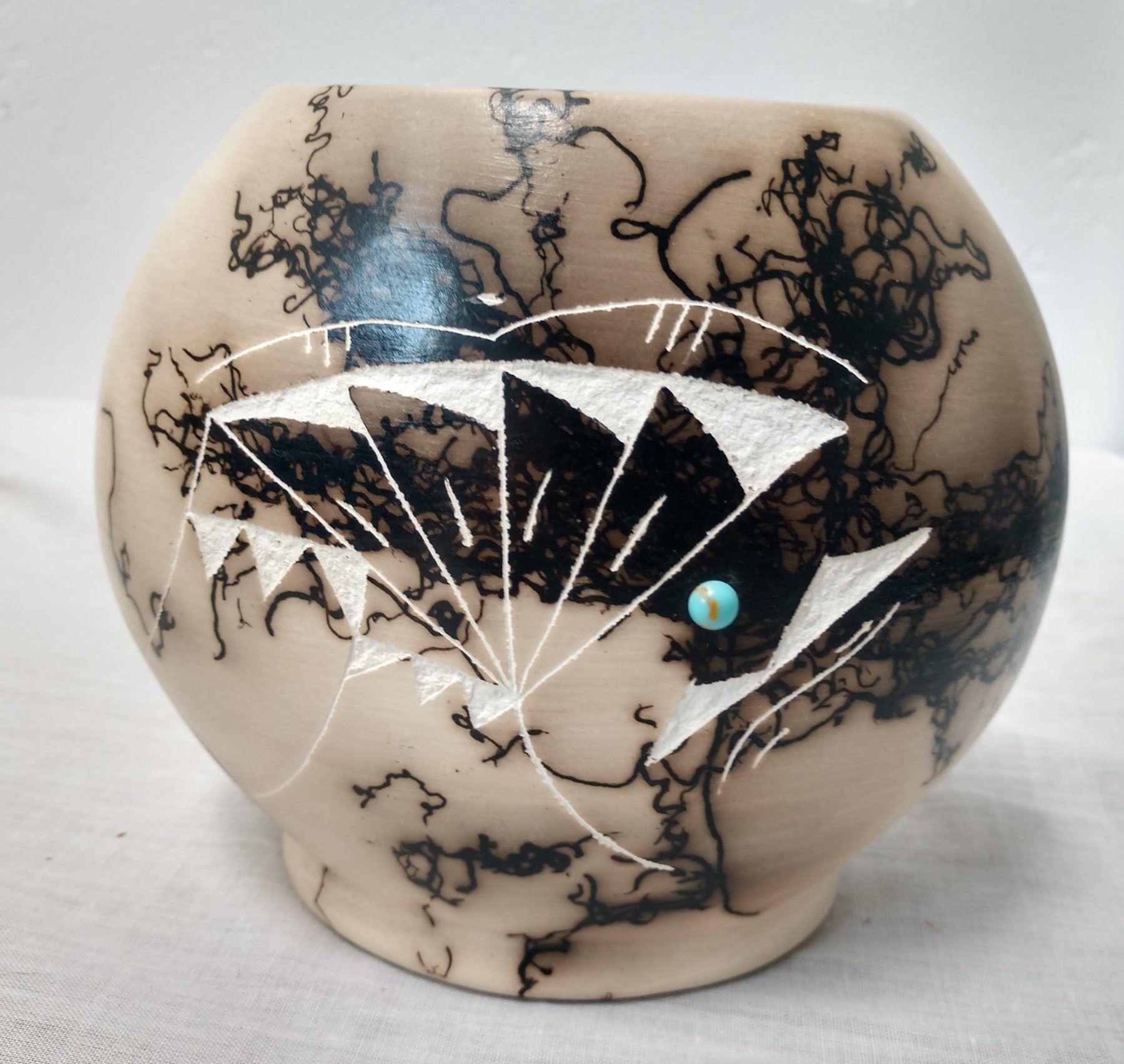Navajo Ceramic Pot, 20th century item. Made of clay, horsehair and turquoise, the item is 5" x 5.5". Navajo, southwest USA. Cute turquoise stone. Condition: Good, see images. Shipping: $18.50 w/insurance and signature.