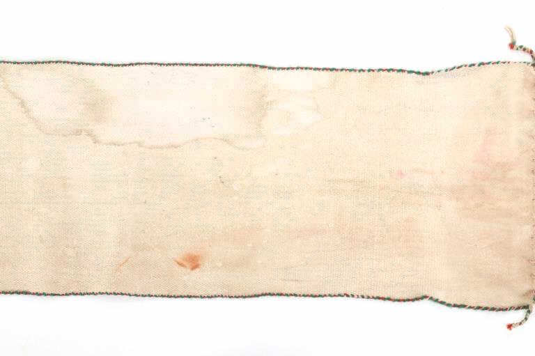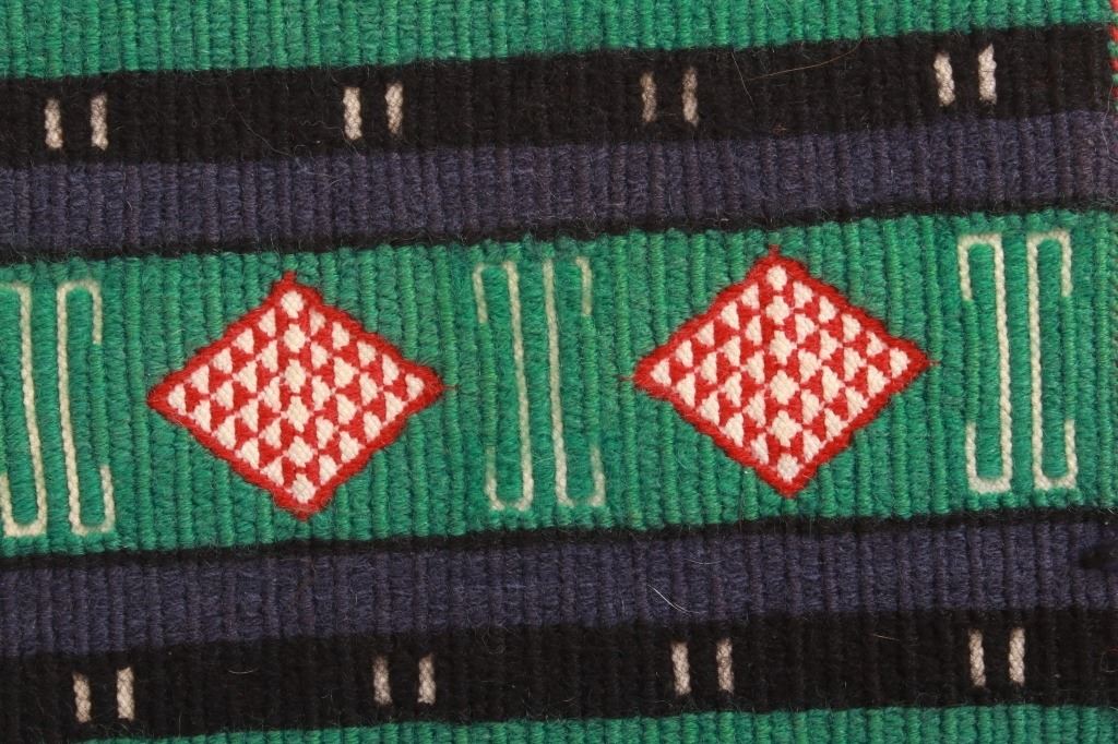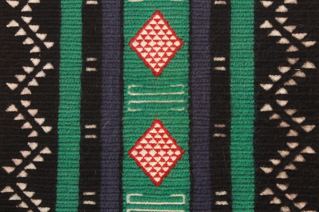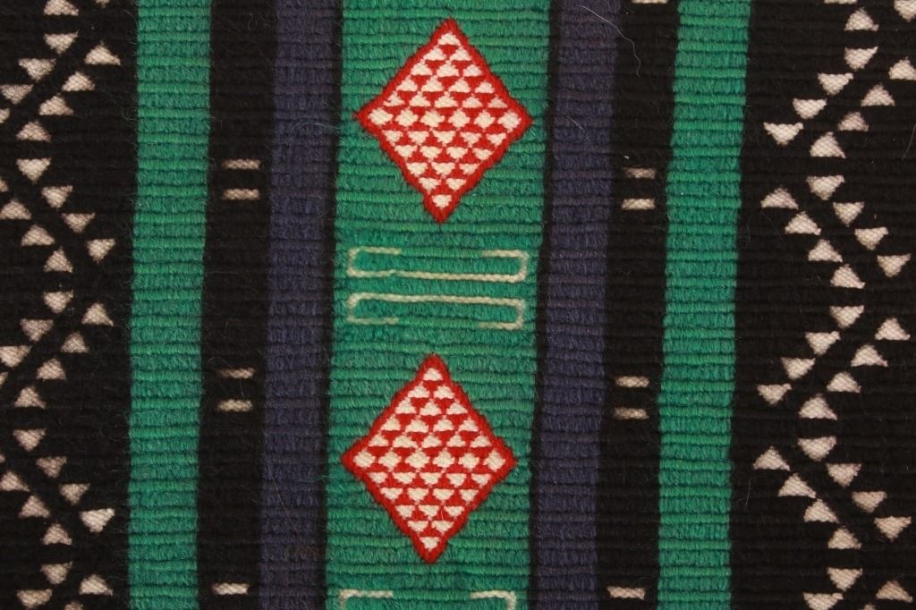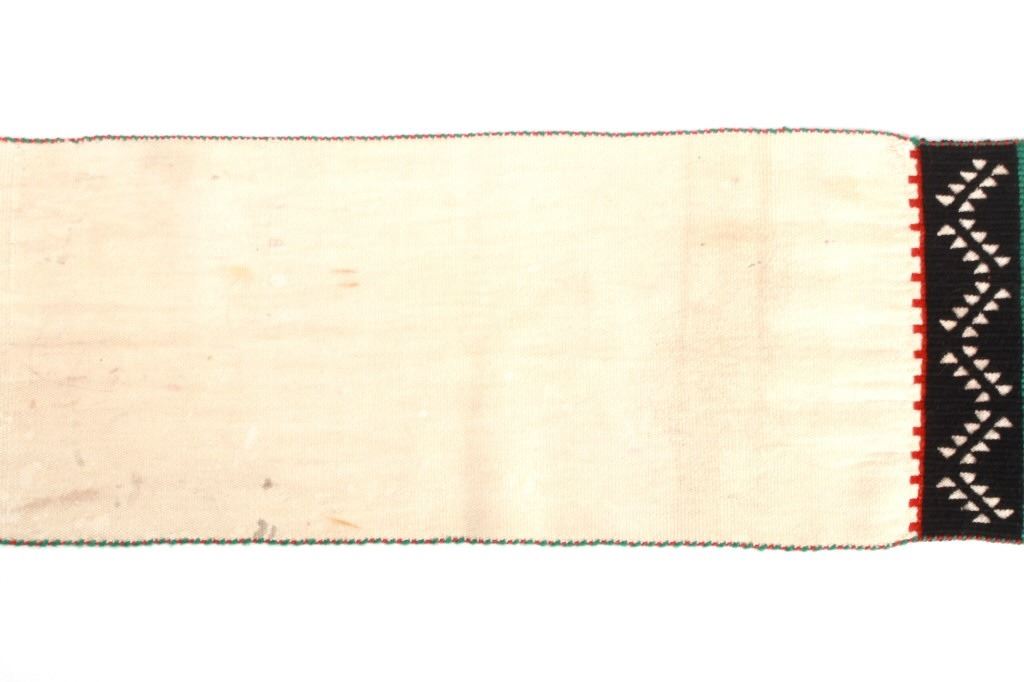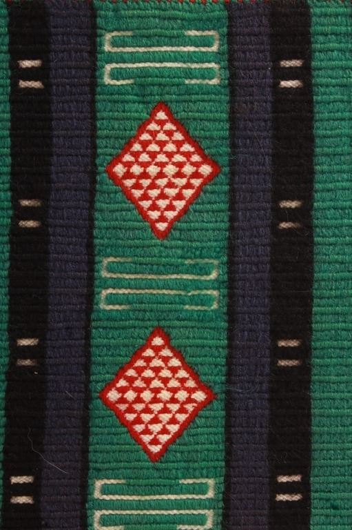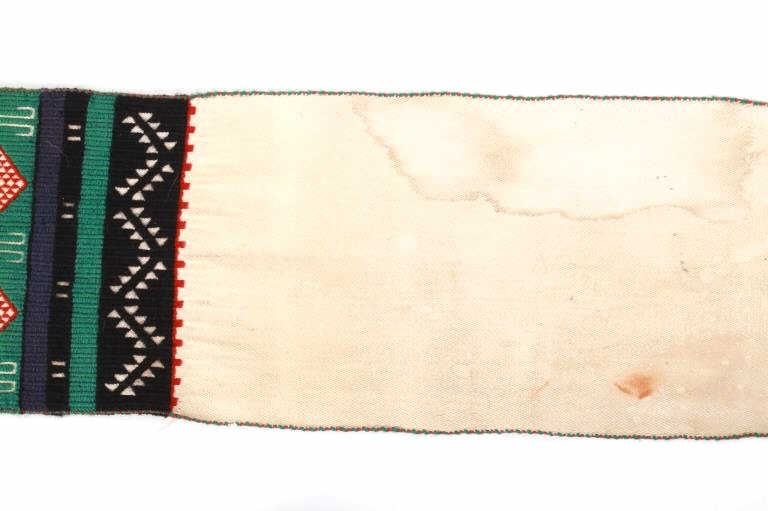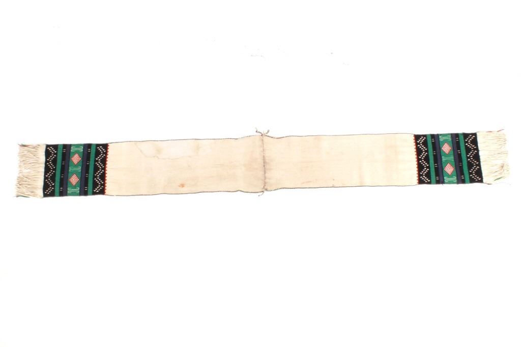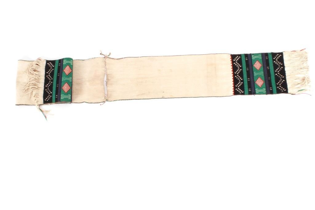 Featured in this lot is this Navajo ceremonial dancer had woven sash circa 1900. The sash features two segments sewn together, the outside rim is a braided border with red and green color wool braids. The majority of the sash is constructed from trade cloth, and each end features expertly woven with geometric patterns shown woven into the trade cloth. Each end shows wonderfully braided fringe adorning the ends. This is a single sided sash with beautiful colors of red, green, black, and blue. The condition of this sash is good with no obvious signs of damage and in good overall condition. The measurements of this ceremonial sash are 86" x 9 1/2". Provenance: From the renowned Sundog Fine Art Bozeman, Montana collection and collected by Bruce VanLandingham. Bruce VanLandingham was a pillar in the American Indian collecting community and a respected expert. Along with being an avid collector, Bruce also was the sole owner of Sundog Fine Art Gallery in Bozeman, which was both part museum and gallery. Identification#: E1044.
