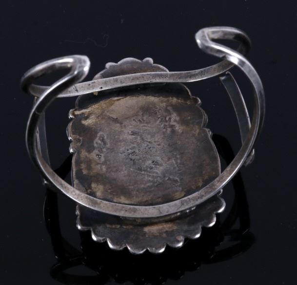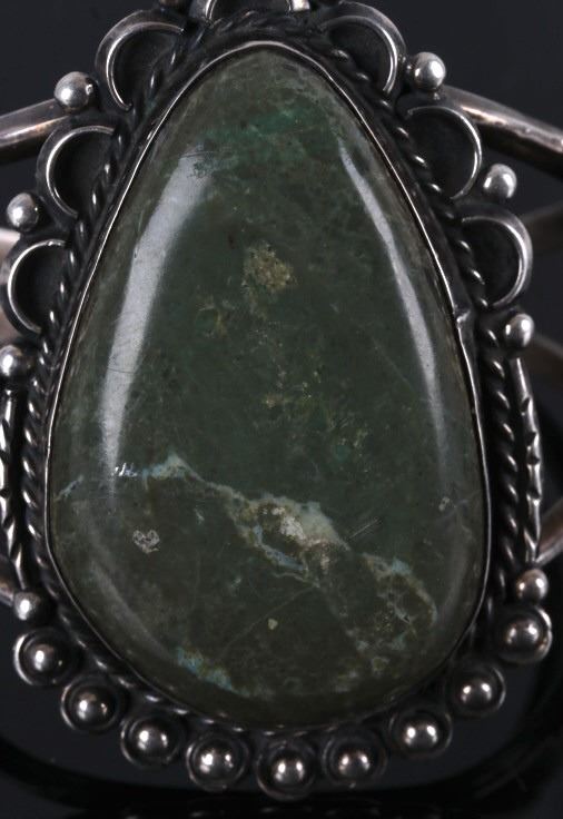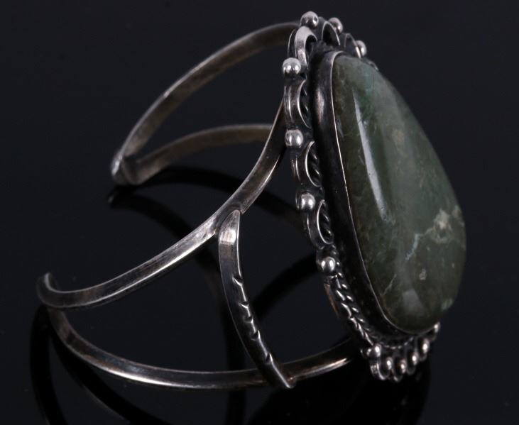 Included in this lot is a Navajo Cerrillos Turquoise silver bracelet. This cuff showcases a large Cerrillos turquoise gemstone in a tear drop cut. The gemstone is held in a decorated silver display. The interior circumference of the bracelet measures 6 1/2".