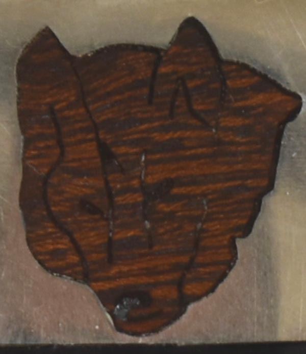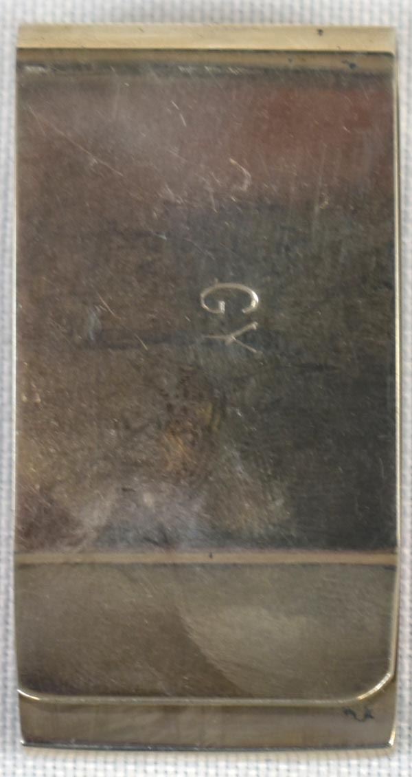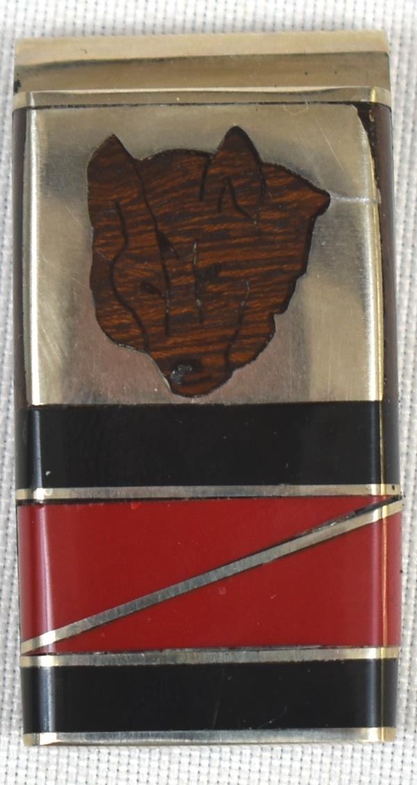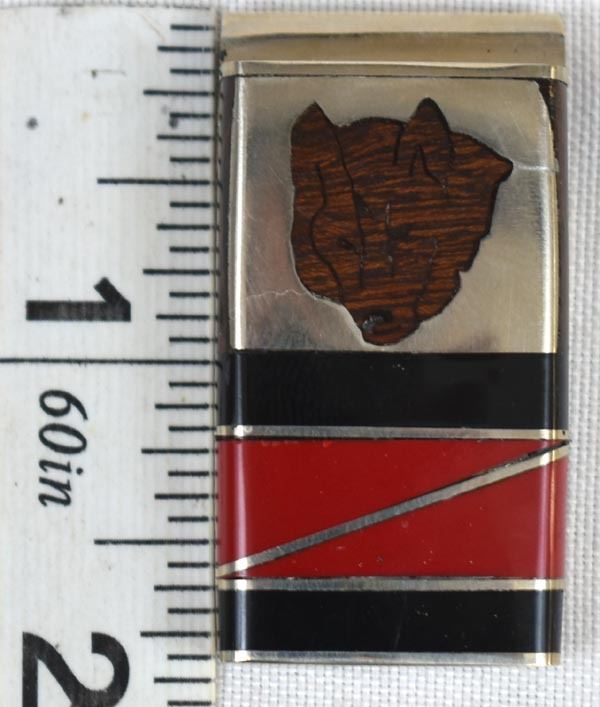 Native American Navajo Channel Inlay Wolf Money Clip by Glenn Yellowhorse, measures 1'' x 1.75'', come with original artist's card, inlay includes jet, coral, and desert ironwood