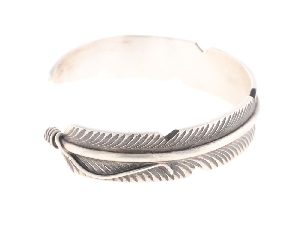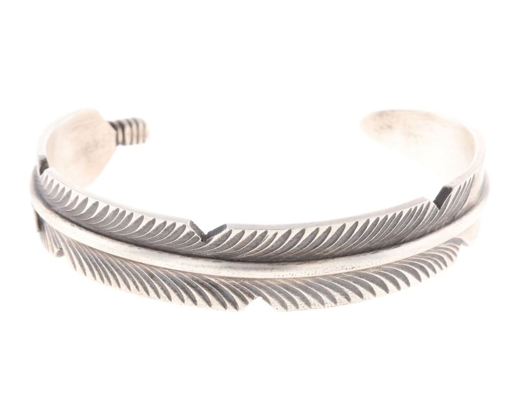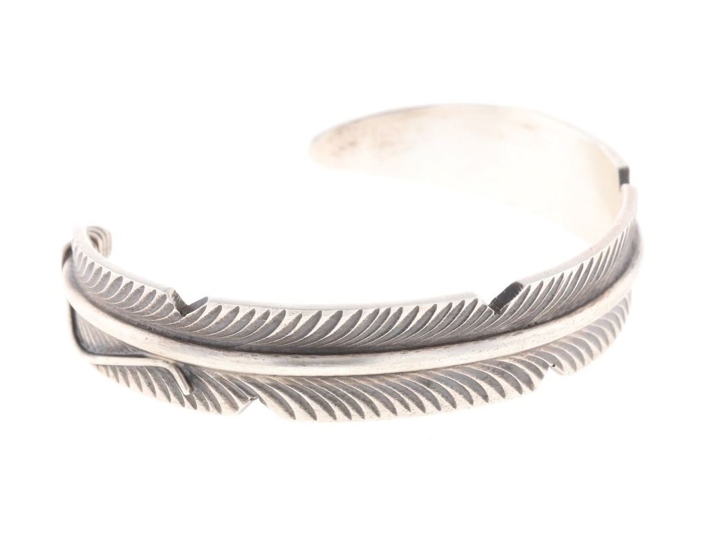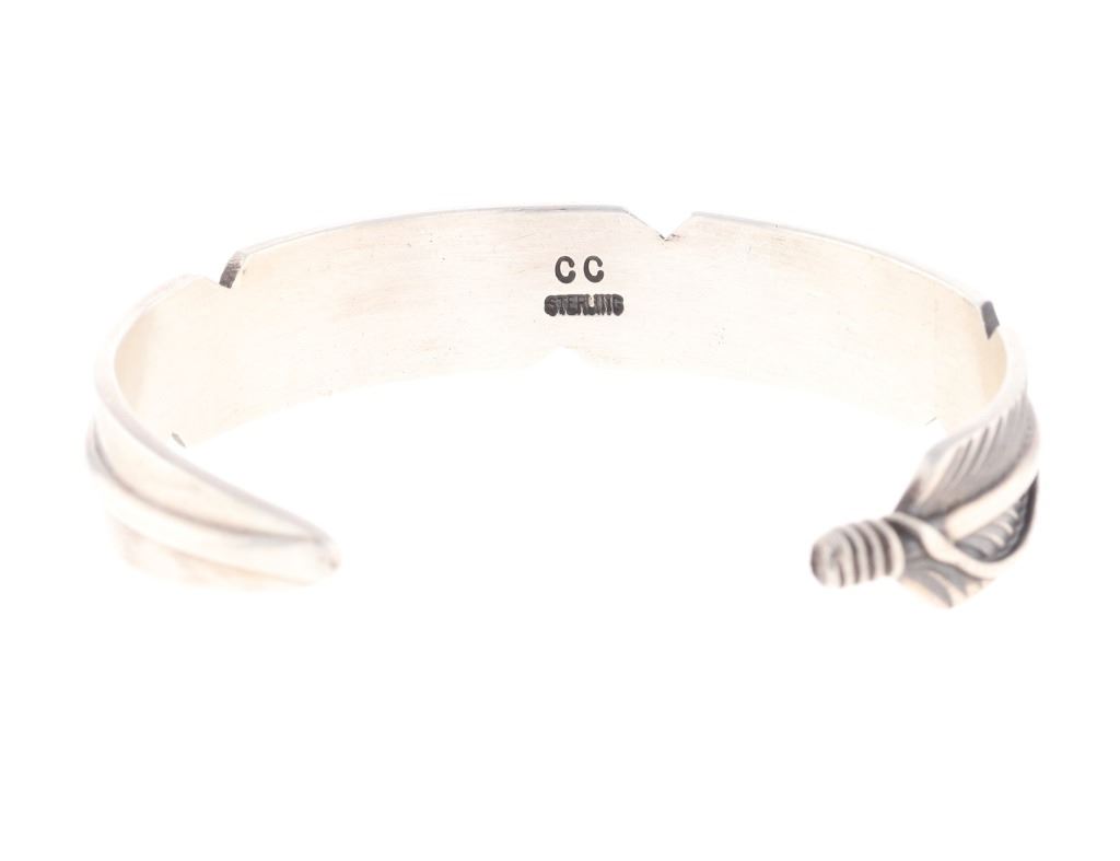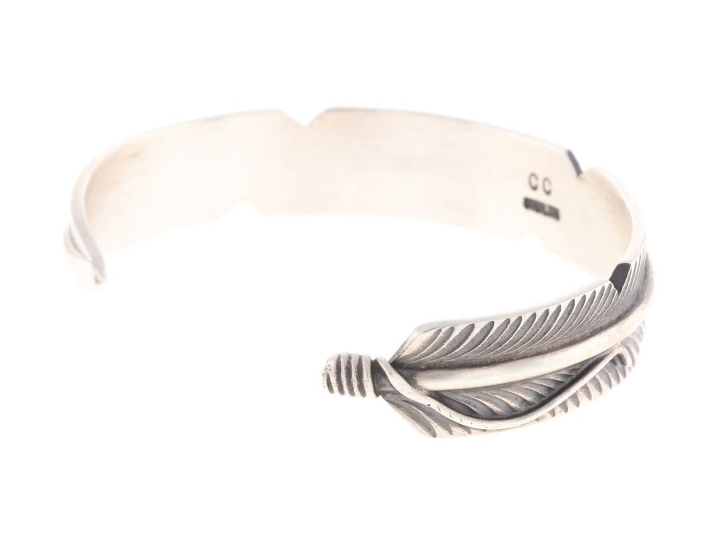 Featured in this lot is this sterling silver feather bracelet from Navajo artist Chalie Chee. The bracelet features a wonderfully and professionally crafted sterling silver feather design with great attention to detail of the decoration. The artist’s hallmark can be seen on the underside of the bracelet above a 'sterling' stamp. The condition of this bracelet is good, with no obvious signs of damage. The measurements of this bracelet are 2" x 2 1/8" x 1/2" and the circumference is 5". The overall weight of the bracelet is 30.7 g.